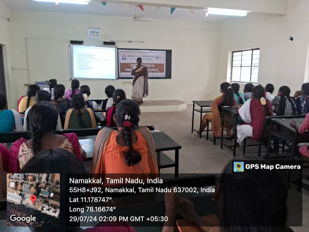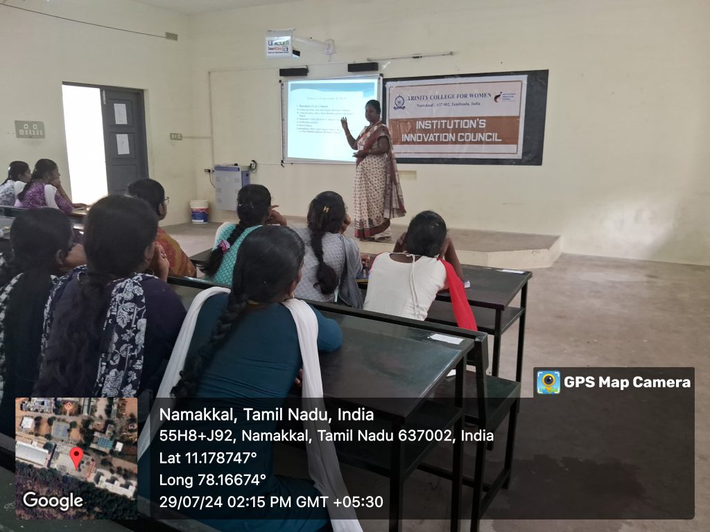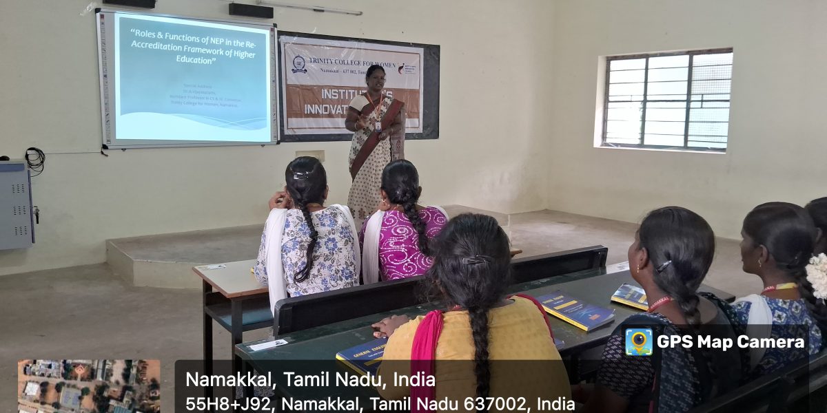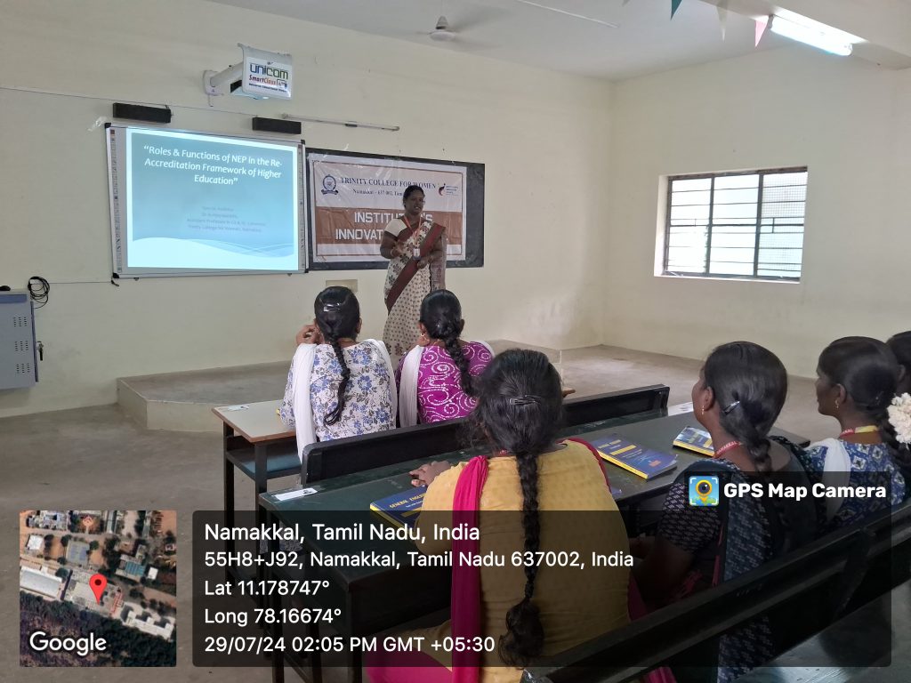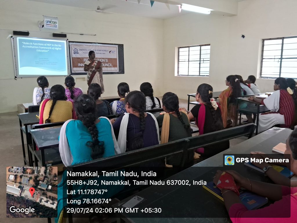 On account of implementation of New Education Policy (2020) in India, Institution’s Innovation Council, in association with the Internal Quality Assurance Cell, Trinity College for Women, Namakkal conducted a programme titled “The Role and Functions of New Education Policy in the Re-Accreditation Framework of Higher Education” on 29th July 2024.   Dr. A. Vijayasarathi, Assistant Professor in Computer Science and Coordinator, Institution’s Innovation Council, Trinity College for Women, Namakkal was the resource person.   In her address, said that NEP will help in getting international recognition for higher education.   Our New Education Policy focuses on multidisciplinary education, online education, reduction in current overload, research and innovation, globalization and the implementation of the technology.   Accreditation is mandatory for all higher educational institutions, she denoted.  In addition, She highlighted the benefits of the new education policy and she shared the vision & mission of higher education in India.    Nearly 100 students actively participated in that programme.