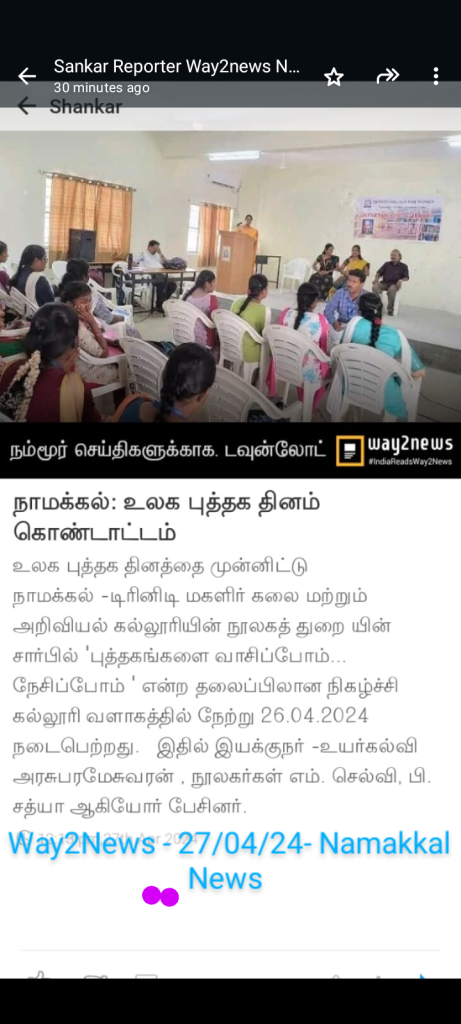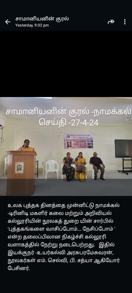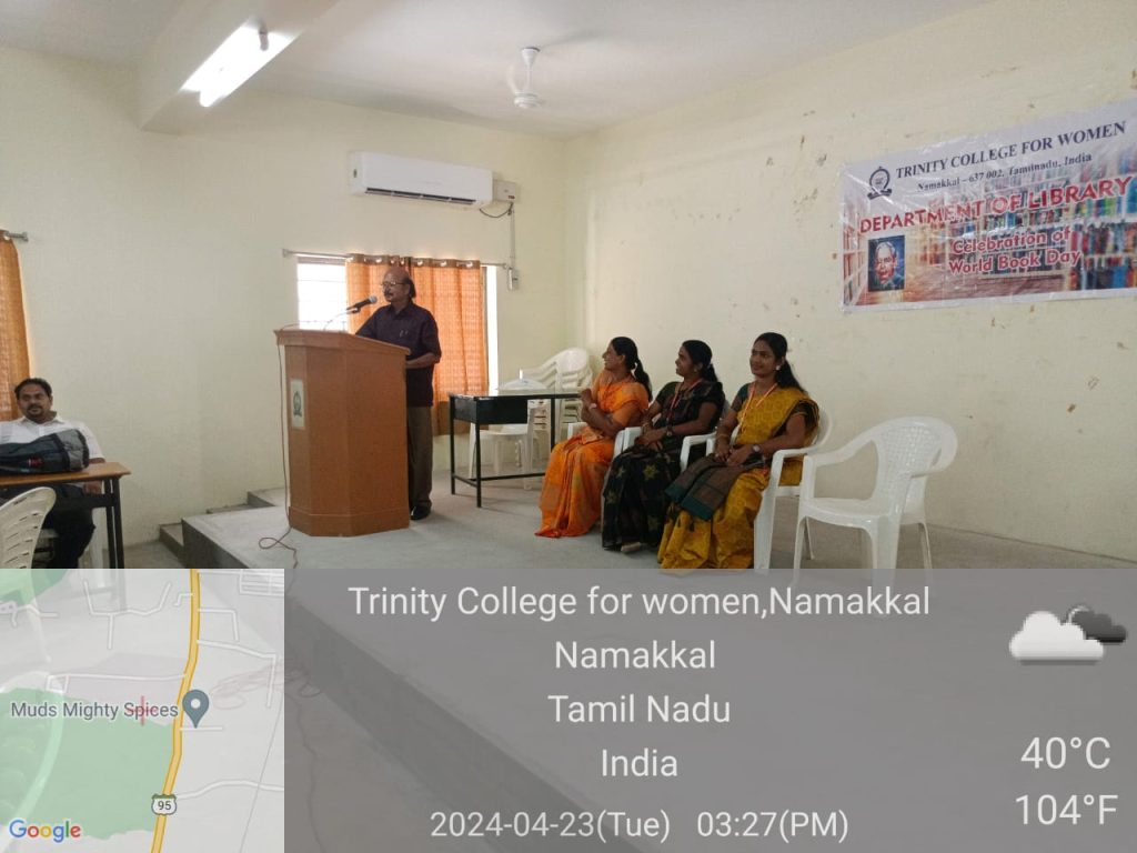 On account of International Book Day, the Department of Library, Trinity College for Women, Namakkal, conducted a program titled “We Read and Love the Books” (புத்தகங்களை வாசிப்போம் நேசிப்போம்)  on April 23, 2024.