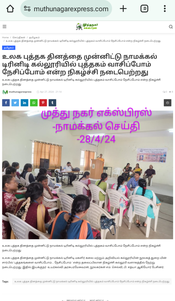 On account of International Book Day, the Department of Library, Trinity College for Women, Namakkal, conducted a program titled “We Read and Love the Books” (புத்தகங்களை வாசிப்போம் நேசிப்போம்) on April 23, 2024.