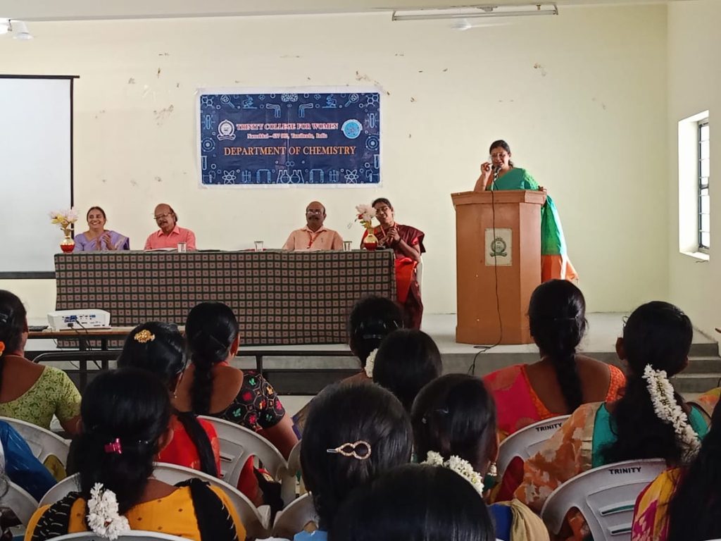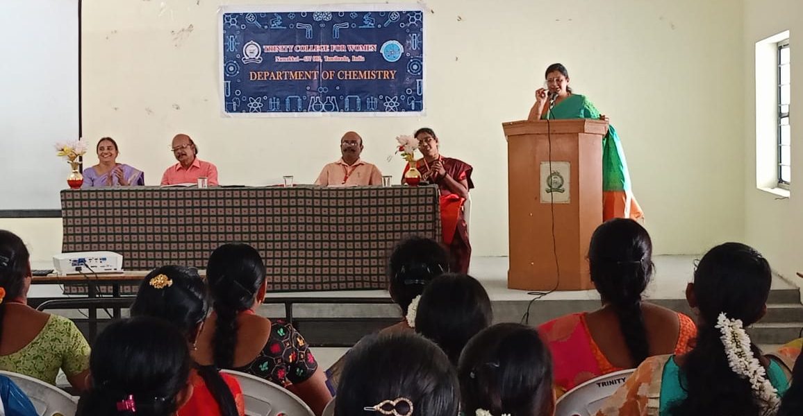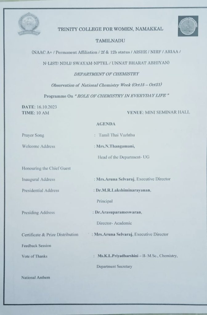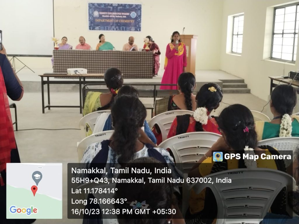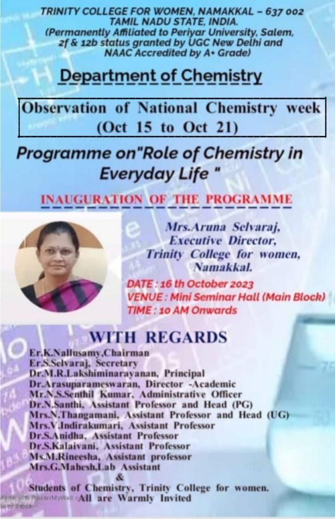 On account of National Chemistry Week (October 15–October 21, 2023) as well as Youth Awakening Day (the birth anniversary of Dr. A.P.J. Abdul Kalam, former President of India), the department of Chemistry at Trinity College for Women, Namakkal, organised a one-day event titled “Role of Chemistry in Everyday Life” on October 16, 2023, on the college campus. Mrs. Aruna Selvaraj, Executive Director, inaugurated and presided over the programme. Chemistry is one of the interesting subjects. It is intertwined with our lives. We use chemical products like diesel, petrol, kerosene, batteries, mobiles, hair oil, hair dye, soaps, dress materials, medicine, etc. all day. Chemistry is also very essential to our country. Many chemists donated a lot to our society, she said.