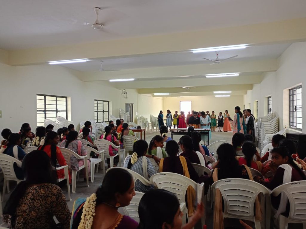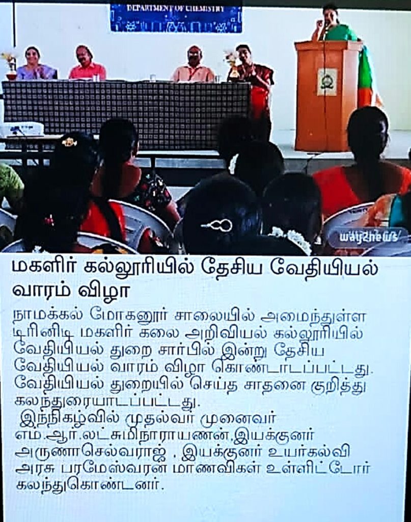 Three students of Chemistry (Ms. B.K. Sowmitha, second year B.Sc., Chemistry, Ms. R. Nishanthini, and Ms. C. Janthini, first year B.Sc., Chemistry) from Trinity College for Women recited the 118 elements of Chemistry in the events. All the audience members convey their greetings to them.