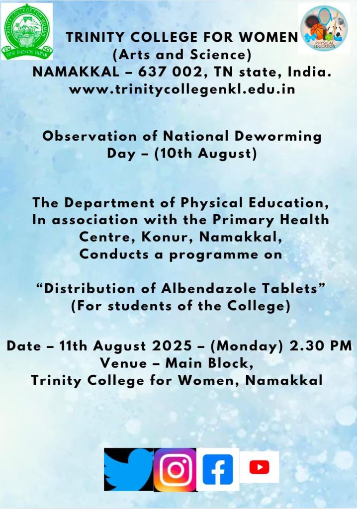 On account of National Deworming Day (10th August), the Department of Physical Education, Trinity College for Women, Namakkal, in association with the Primary Health Centre, Konur, Namakkal, distributed “Albendazole Tablets” to the students of the College on 11th August 2025 in the College campus.