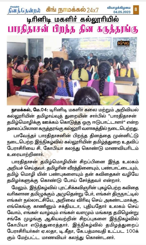 On account of Paavendhar Bharathidasan’s birth anniversary, the PostGraduate Research Department of Tamil, Trinity College for Women, Namakkal celebrated his birthday on 29th April 2023. It was held on the college campus.