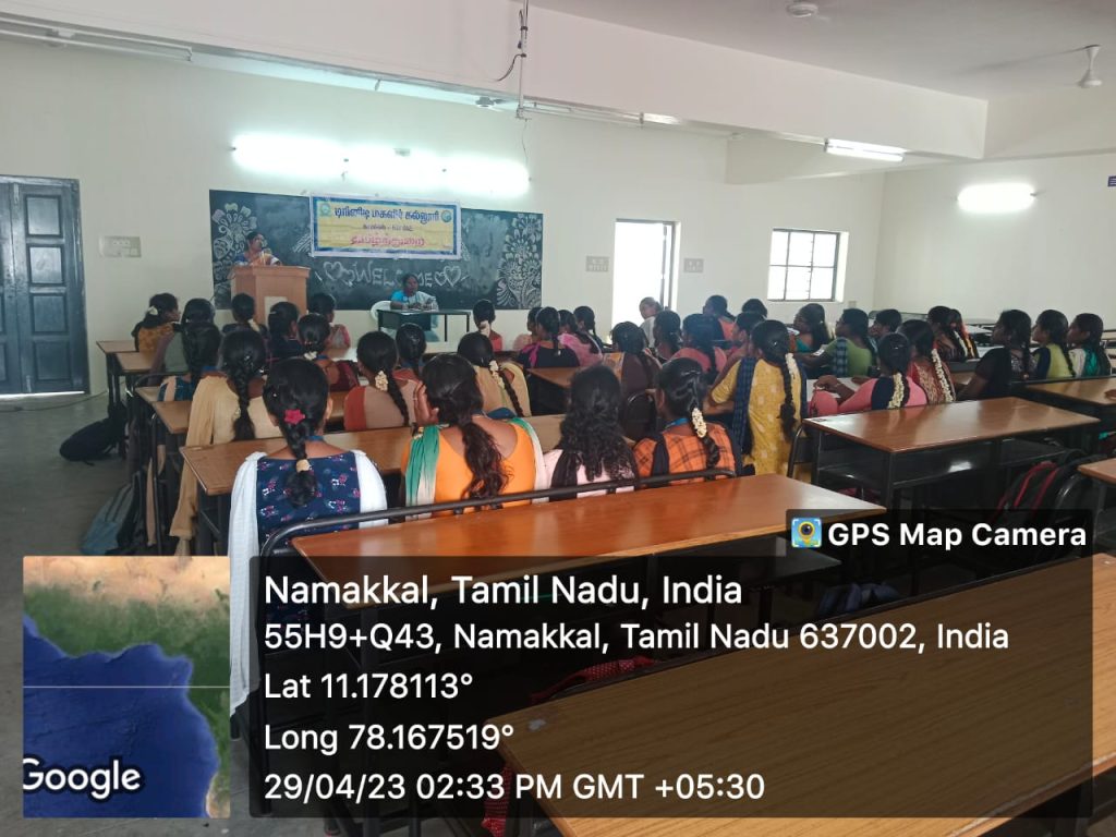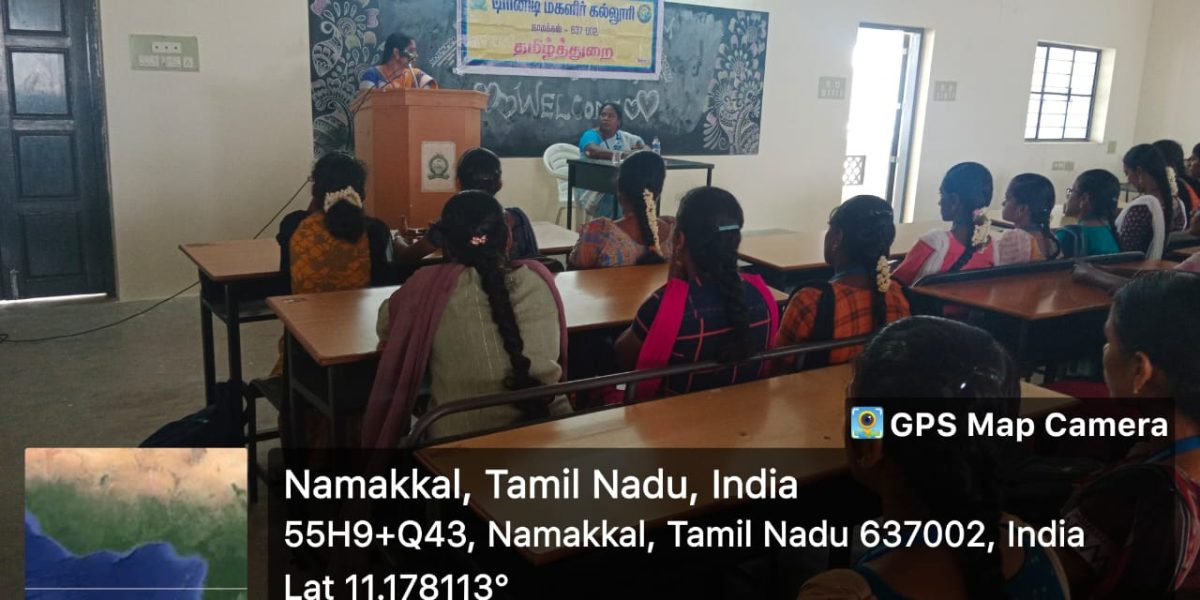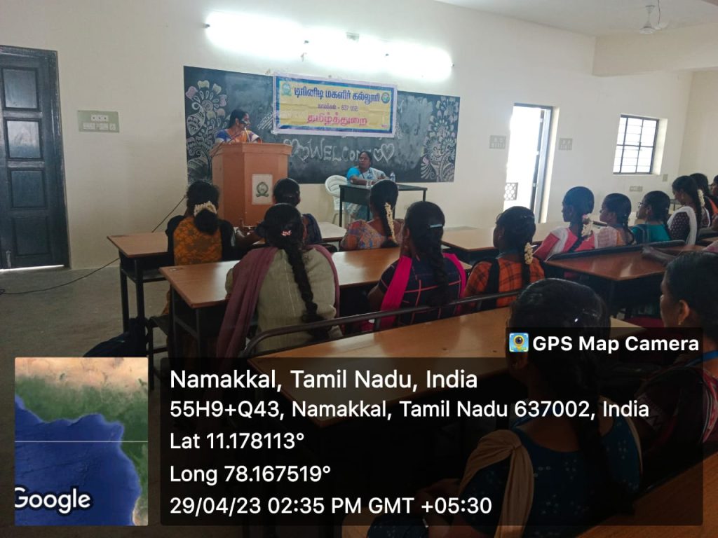 Dr.C.Gobiya, Assistant Professor in Tamil, Trinity College for Women, Namakkal delivered in the topic of “Bharathidasan – A spirited devotee of Tamil language” (பாரதிதாசன் – தமிழ் மொழிக்கு ஊக்கம் கொடுத்த ஒரு ஈடுபாட்டாளர்). Bharathidasan’s indescribable affinity to the Tamil language, character and country of the Tamil always merged with Indian nationalism, she said. Also, she highlighted the reputed quotes by Bharathidasan, like “Expand knowledge – make it universal” (அறிவை விரிவு செய் – அகண்டமாக்கு), “we will create a brave new world” (புதியதோர் உலகம் செய்வோம்) and so on. . More than 100 students took part in that programme.