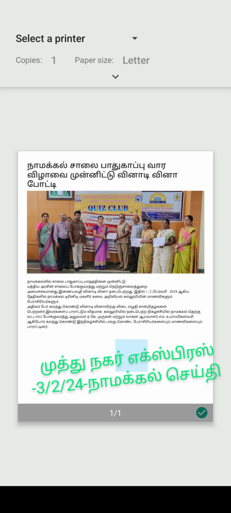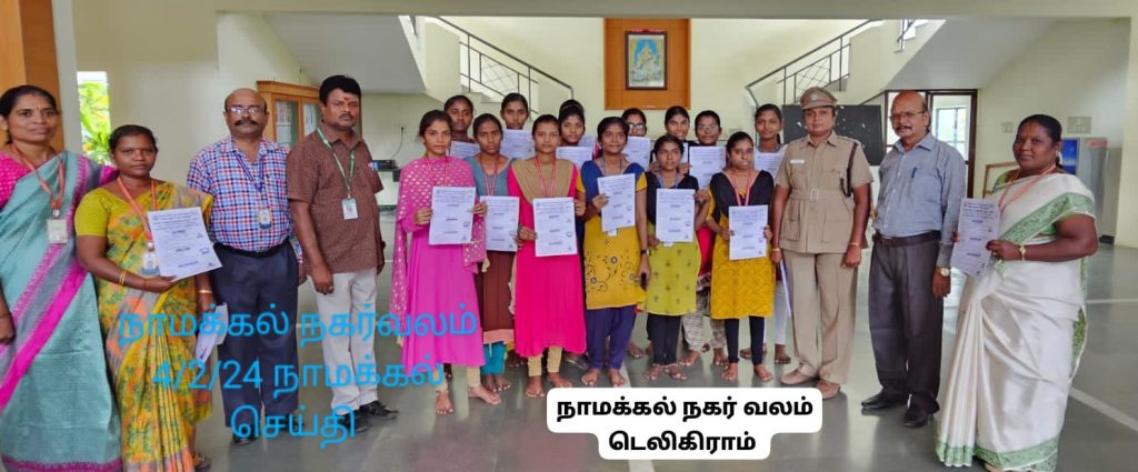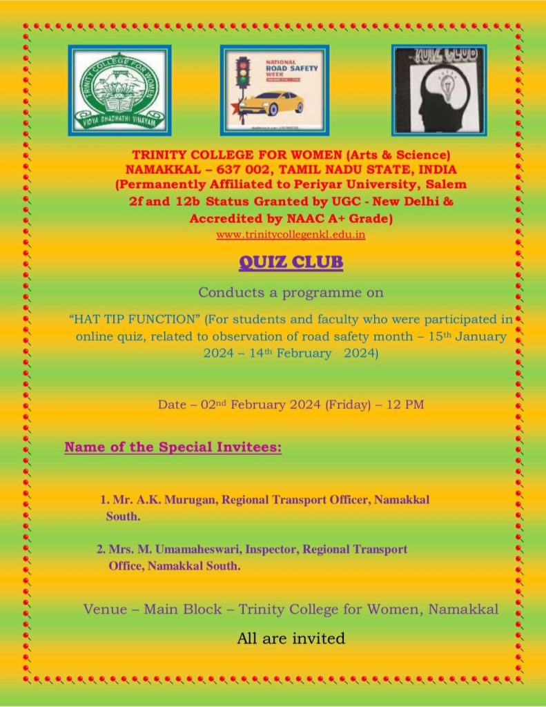 In continuation, a felicitation function was held on 02nd February 2024 in the College campus. Mr. A.K.Murugan, Regional Transport Officer, Namakkal South and Mrs. M. Umamaheswari, Vehicle Inspector, Namakkal South took part in that function and they appreciated all the participants who participated in that online event. Dr. M.R. Lakshiminarayanan, Principal, Dr. Arasuparameswaran, Director – Academic, Dr. A. Latha, Programme Officer, Quiz Club, Dr. S. Devi, Adjacent, Citizen Consumer Club, Mrs. K. Mekala, AP in Computer Science, Dr.C. Gobiya, Dr. R.A. Anitha, faculty of Tamil and some of the students took part in that programme.