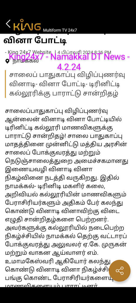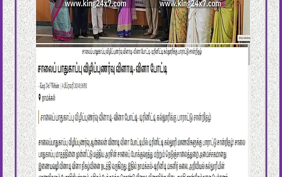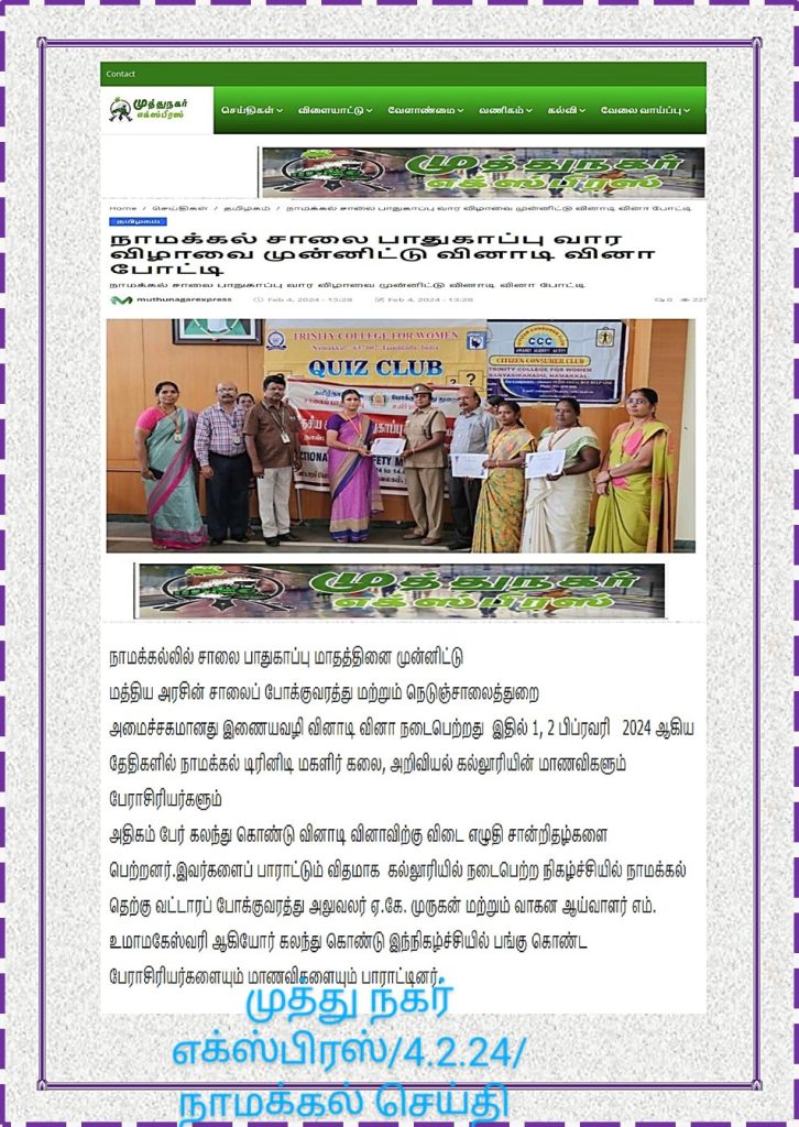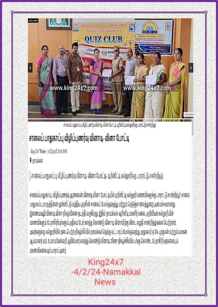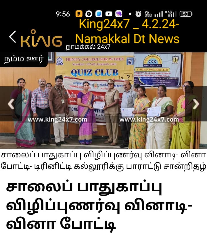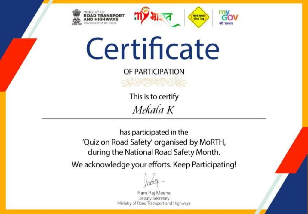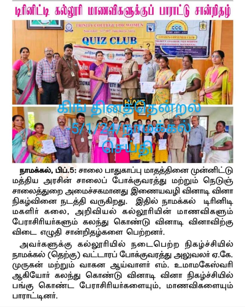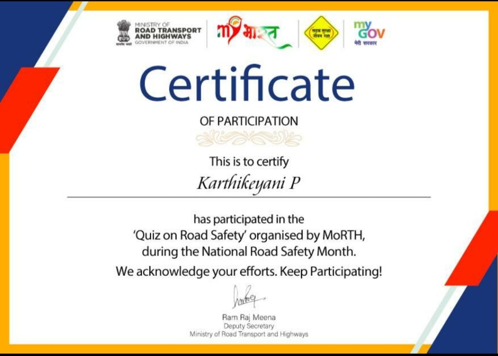On account of Road Safety Month (15th January 2024 to 14th February 2024), The Ministry of Road Transport and Highways, in collaboration with My Government organized an online quiz event titled “Road Safety” in the first week of January 2024. The main aim of the programme, to encourage the student community, to make proactive contributions to the safer road environment. They have to give the answers for 10 questions within 300 seconds. More than 500 faculty and students of Trinity College for Women, Namakkal have actively participated in that online event and they got the E-Certificate. This online quiz questions consists of demerits of drunken driving, follow up the traffic rules, wearing of seat belts and helmets, rule of free passage for ambulance and fire vehicles, rule of signal colours like orange, red and green, etc.,