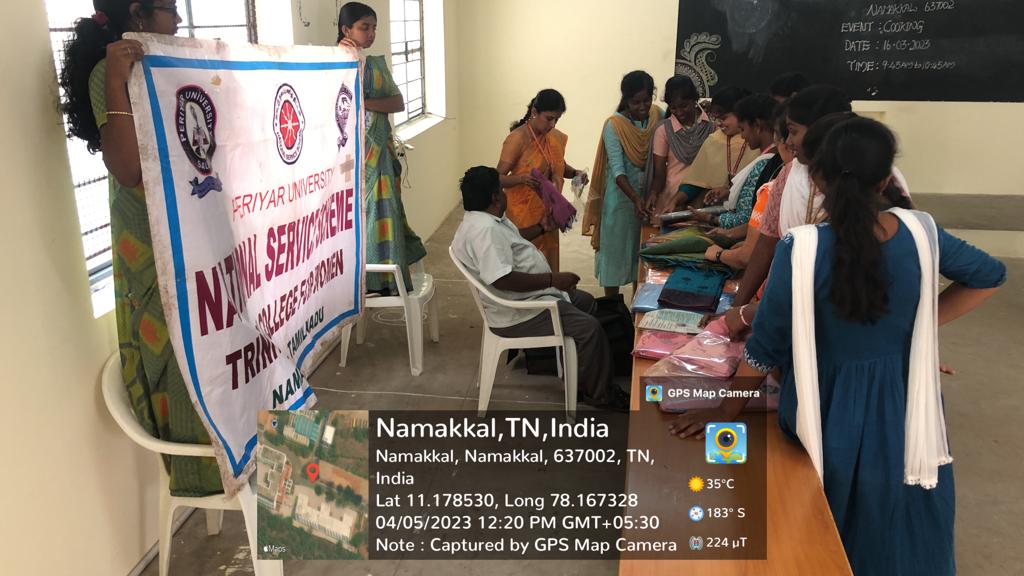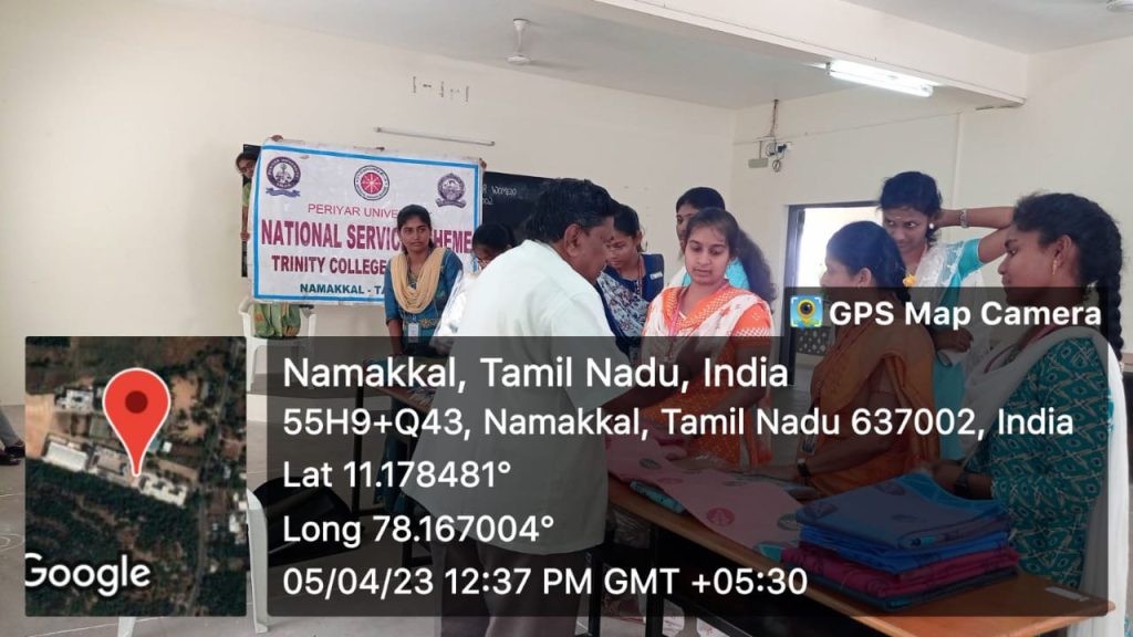 The handloom saree weavers do not use chemical dyes to print as the machine looms or powerlooms. They utilize only natural dyes. On this subject, on account of safeguarding pollution and the promotion of livelihood of handloom weavers, the NSS cell of Trinity College for Women, Namakkal conducted a “Handmade Saree Expo cum Sale” on 05th April 2023. It was held in the hall No 3 of the College main campus.