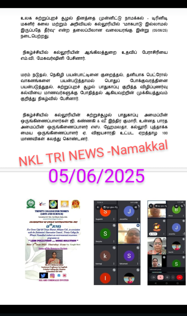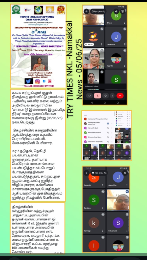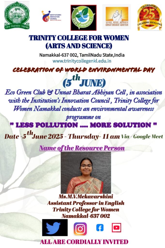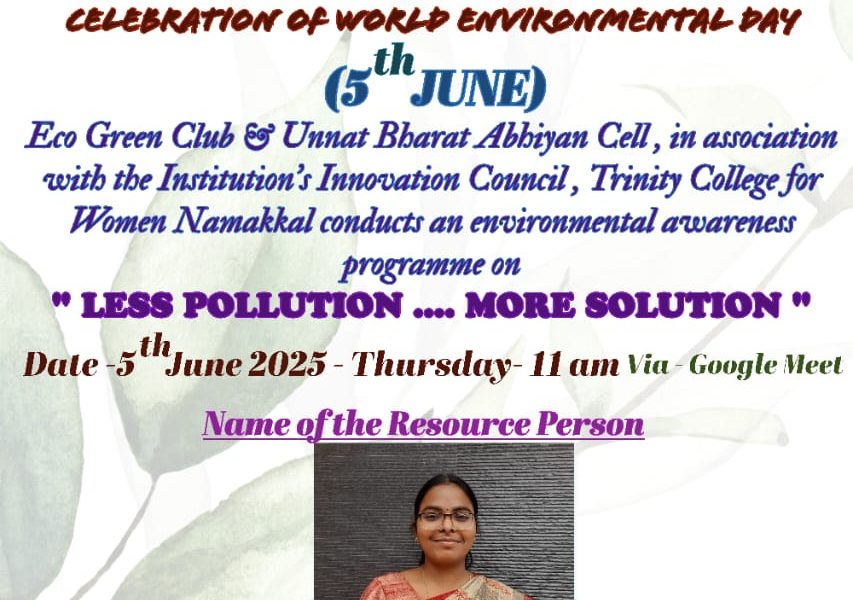 On account of the International Environment Day (05th June), the Eco Green Club and Unnat Bharat Abhiyan Cell, in association with the Institution’s Innovation Council, Trinity College for Women, Namakkal, conducted an awareness programme on 05.06.2025. It was held through the platform of Google Meet.