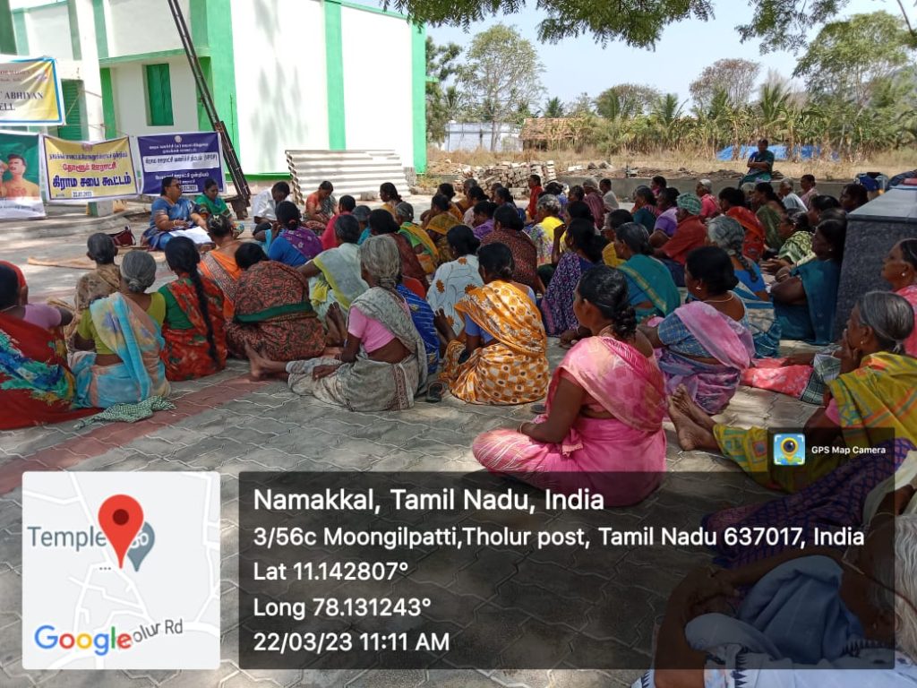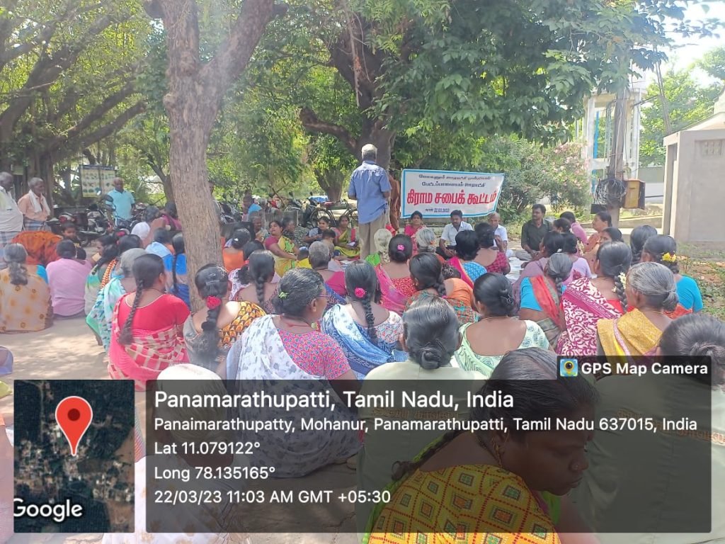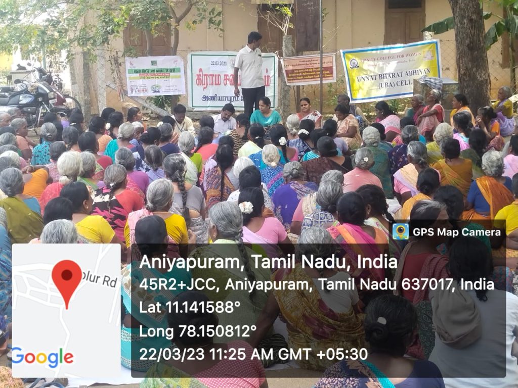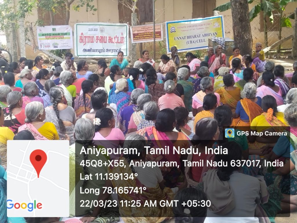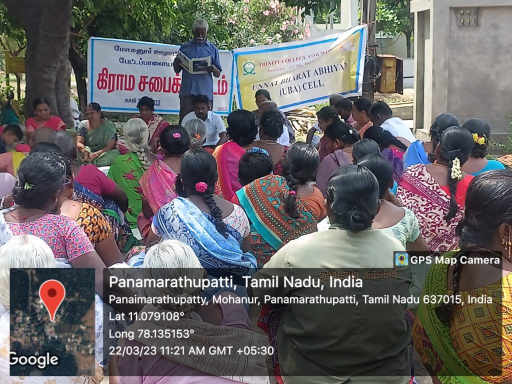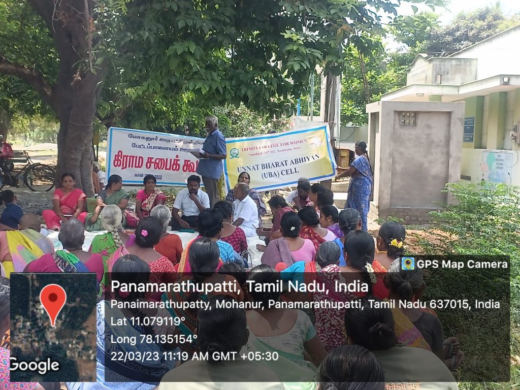 On account of World Water Day, Grama Sabha Meeting was held in the various villages of Tamil Nadu state on 22nd March 2023. Under the scheme of Unnat Bharat Abhiyan, Trinity College for Women, Namakkal, faculties and students of Trinity College for Women, Namakkal attended the Grama Sabha meeting; it was conducted at the adopted villages of Unnat Bharat Abhiyan Scheme like Vaguramaptti, Parali, Aniyapuram, Tholur and Pettapalayam in Namakkal District.