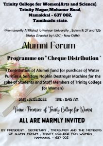 On behalf of Alumni Forum of Trinity College for Women, Namakkal, Rs. 107700/- (Rupees one lakh seven thousand and seven hundred only) donated for purchasing water doctor (Water purified) and Sanitary Napkin Disposal Machines to the main block and science block for the benefit of staff members and students. This programme was held on 16.05.2022.