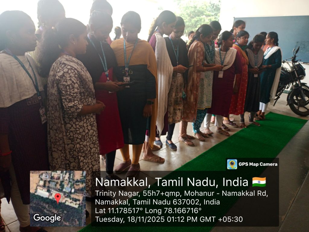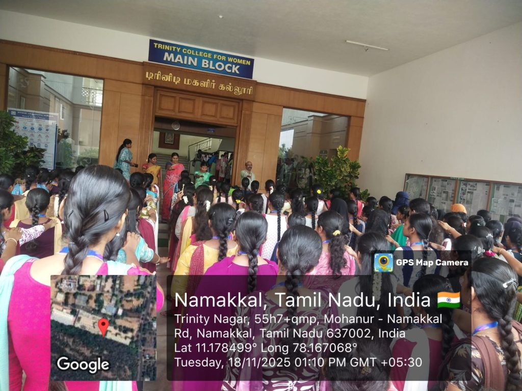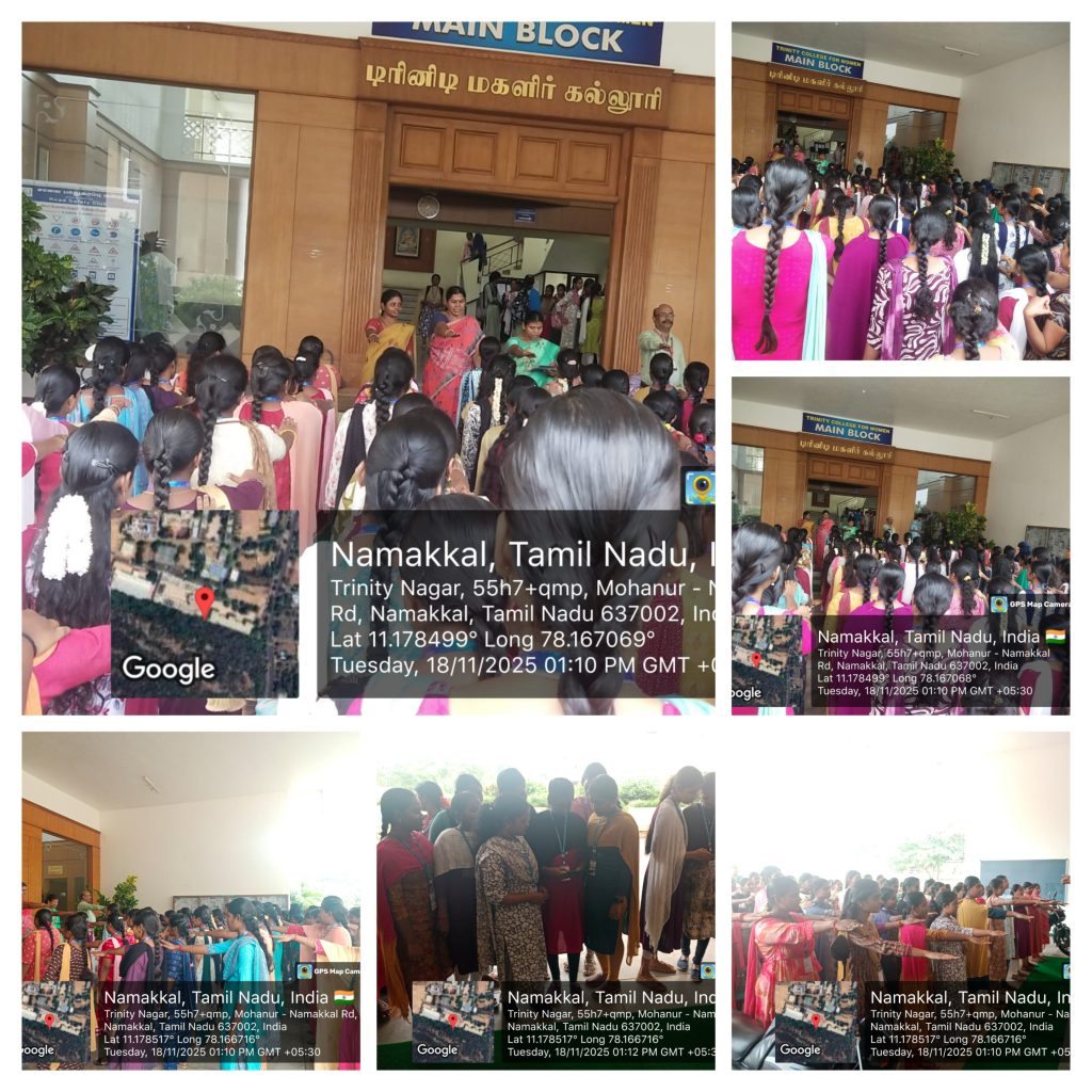 On behalf of Anti-Drug Club, in association with the National Service Scheme, Trinity College for Women, Namakkal conducted a pledge-taking ceremony titled “Nash Mukt Bharat Abhiyan Progamme” (Drug Free India Campaign) on 18th November 2025 on the College premises. This programme’s aim is to raise awareness about drug-free India.