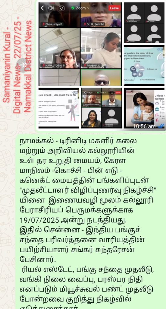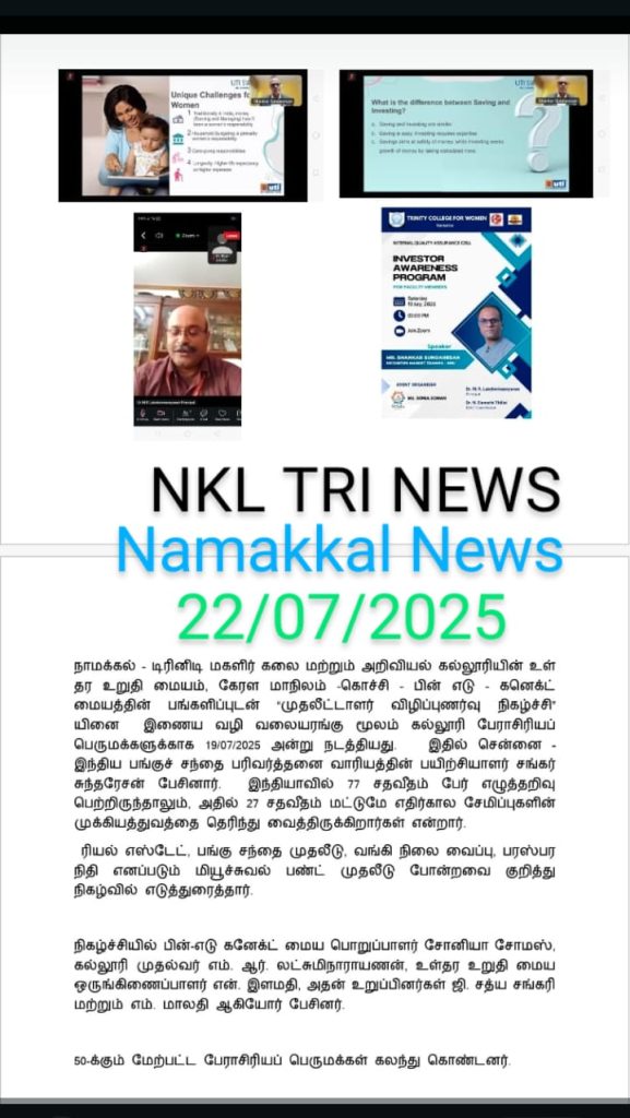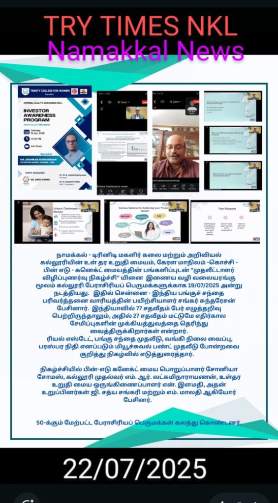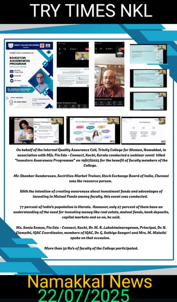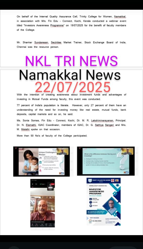 On behalf of Internal Quality Assurance Cell, Trinity College for Women, Namakkal, in association with “Fin Edu – Connect, Kochi, Kerala” conducted a webinar event titled “Investors Awareness Programme” on 19th July 2025. It was held through the virtual mode of Zoom.