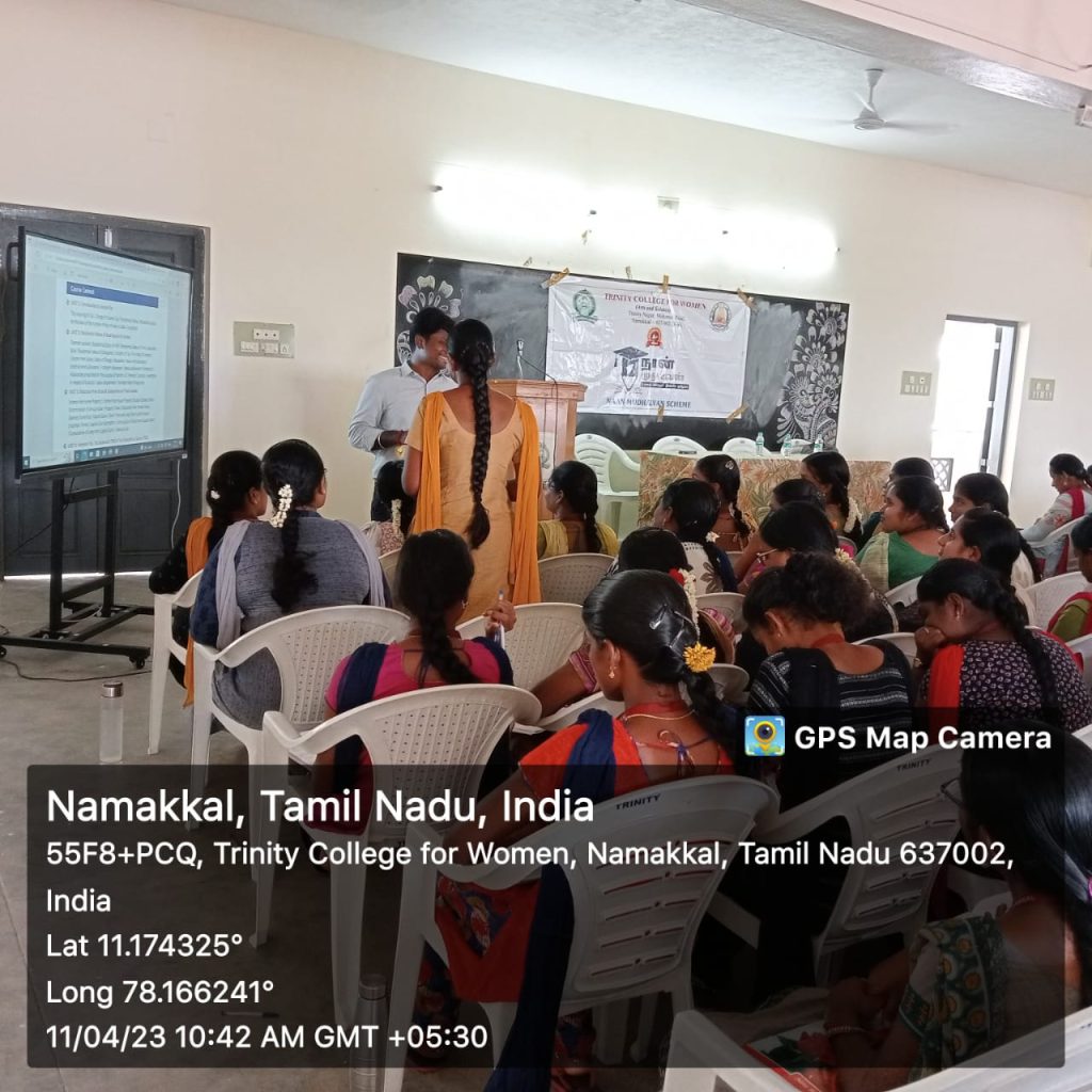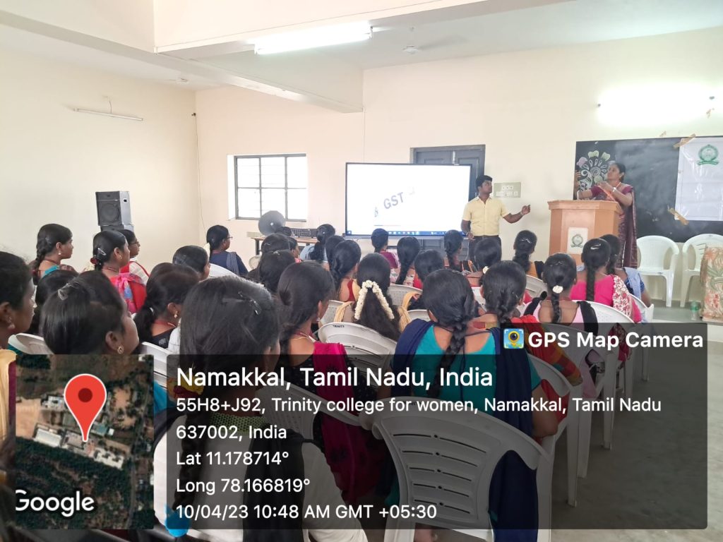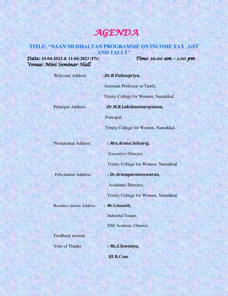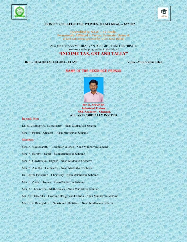 On behalf of Naan Mudhalvan Scheme, Trinity College for Women, Namakkal organized a two day programme in the title of “Income Tax, GST and Tally” on 10.04.2023 and 11.04.2023. It was held in the premises of the mini seminar hall of the College.