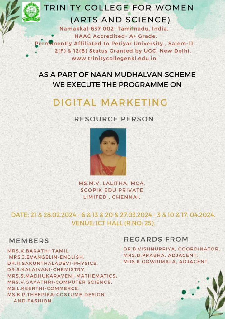 On behalf of Naan Mudhalvan, Trinity College for Women, Namakkal conducted a programme titled “Digital Marketing” on 21 & 28.02.2024, 06, 13, 20 & 27.03.2024 and 03, 10 & 17.04.2024”.