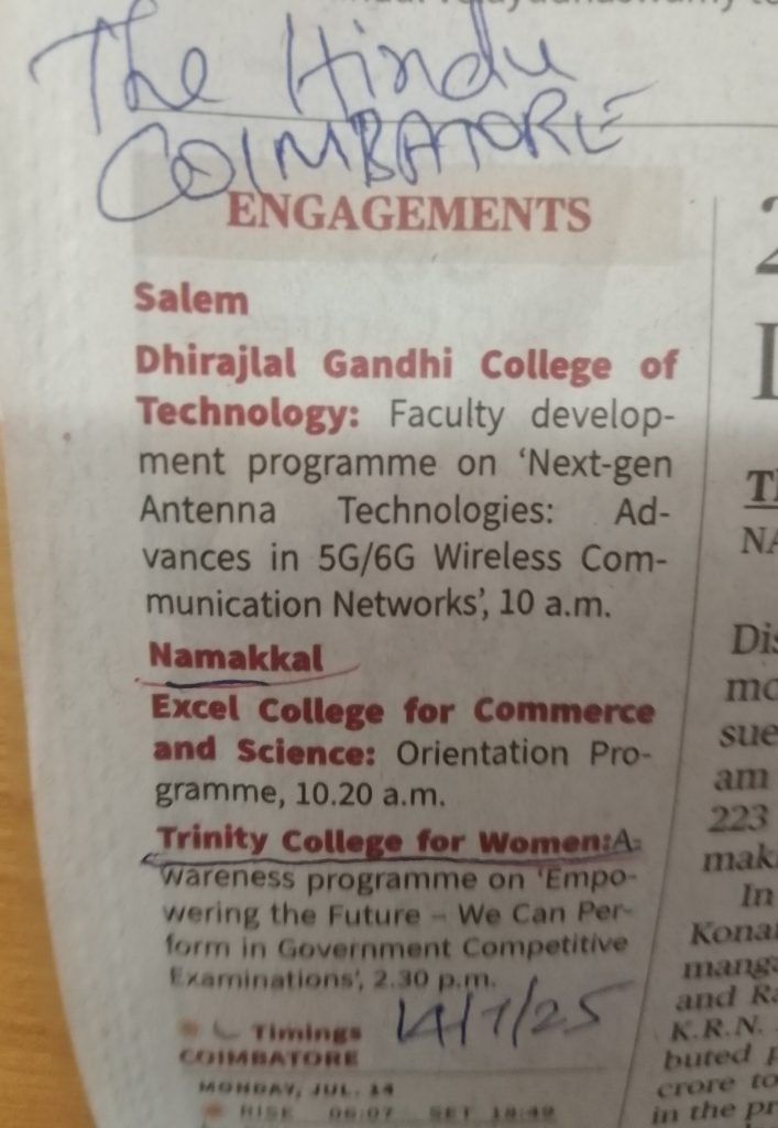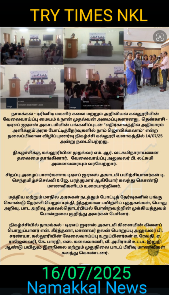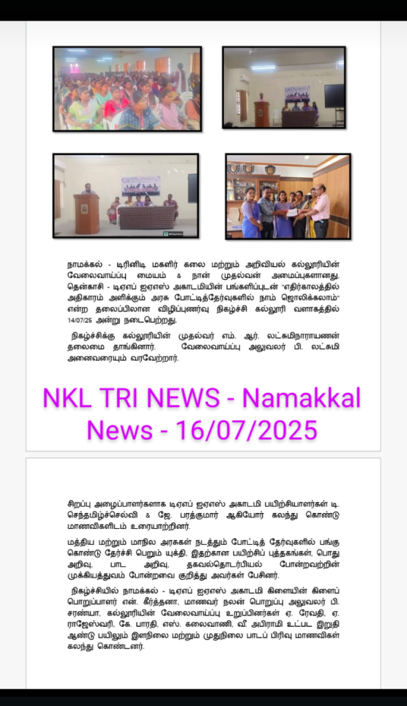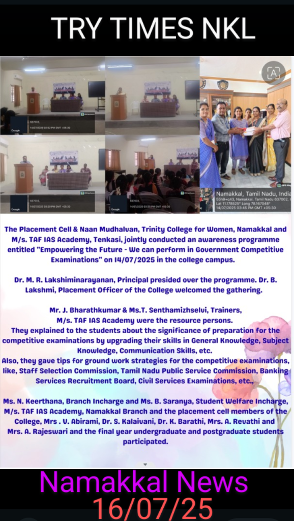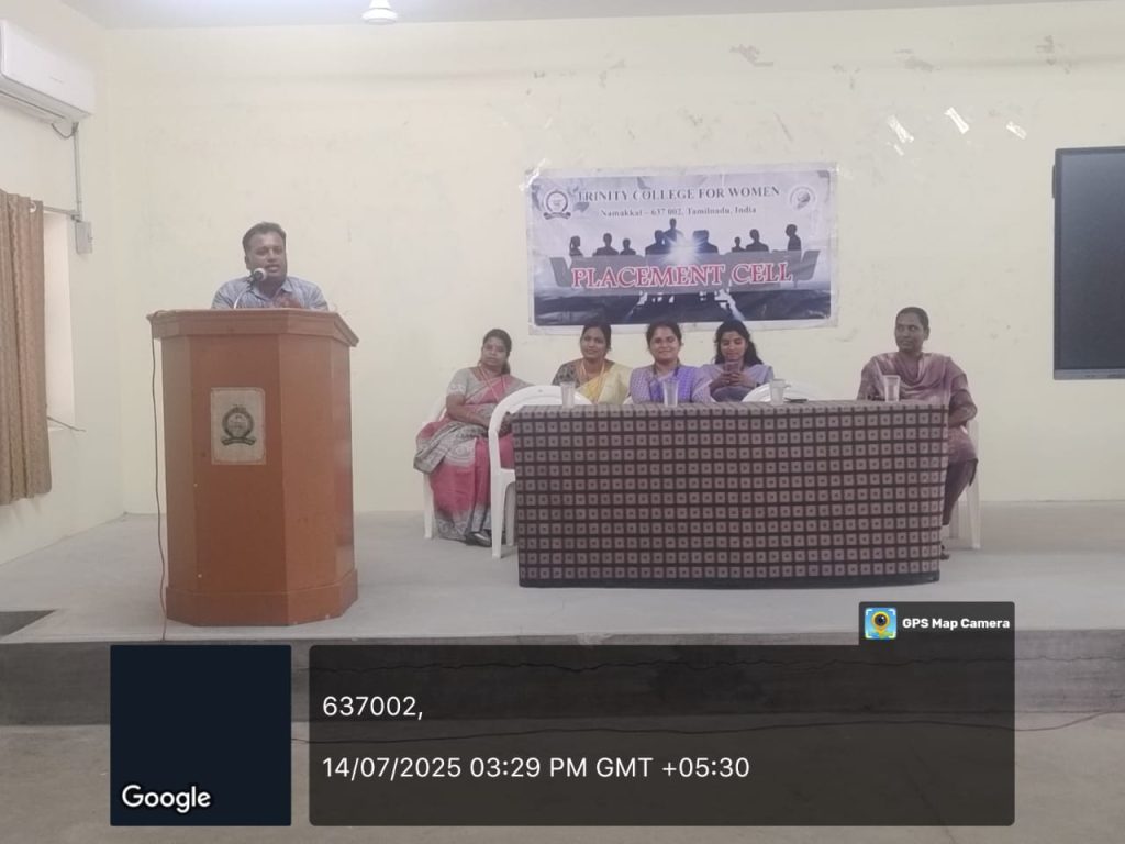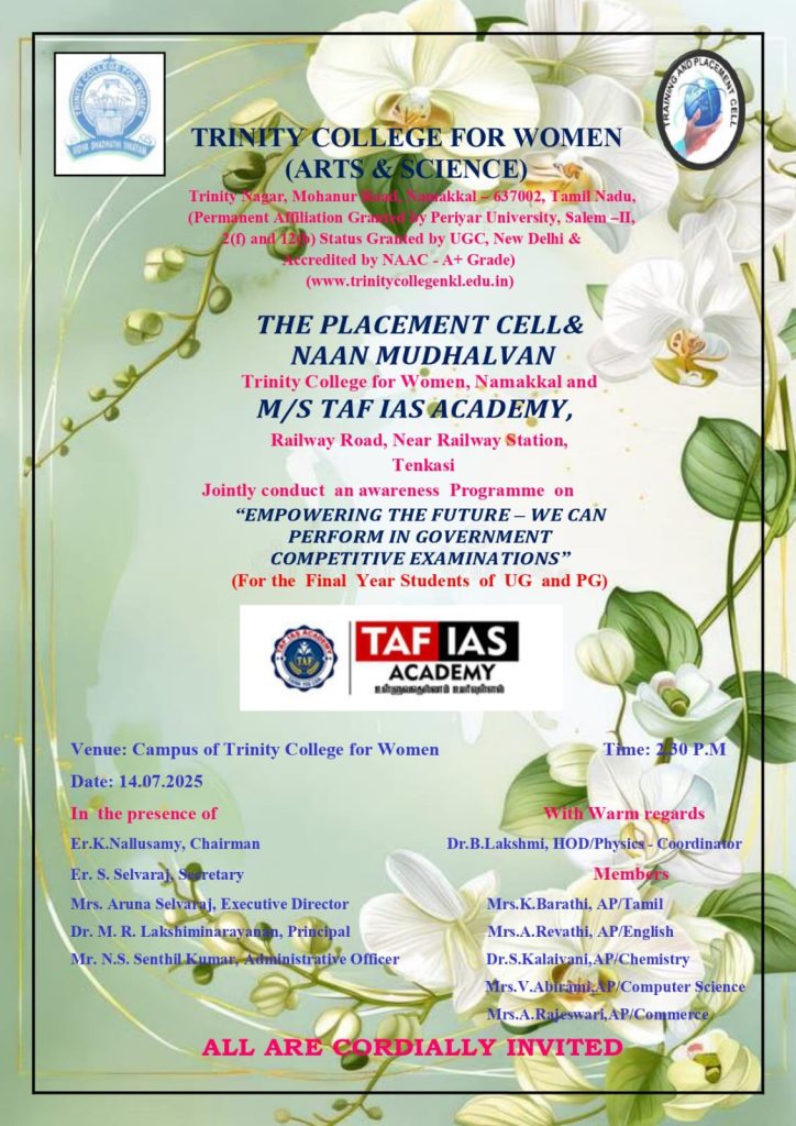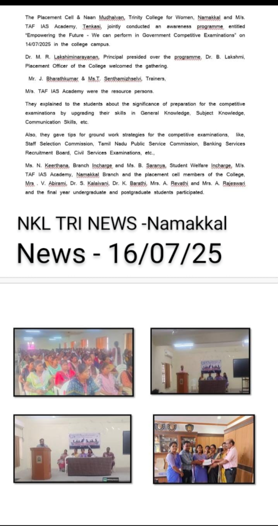 On behalf of Placement Cell & Naan Mudhalvan of Trinity College for Women, Namakkal and M/s. TAF IAS Academy, Tenkasi jointly conducted a programme titled “Empowering the Future – We can perform in Government Examinations” on 14.07.2025 on the College campus.
