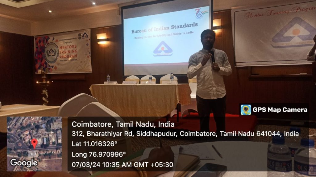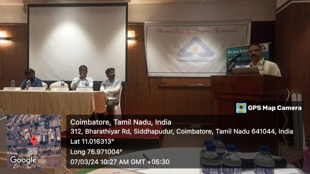 On behalf of Standard Club, the Mentor Training Program was held on the premises of Hotel CAG Pride (Galleria Hall, First Floor), New Sidhapudur, Coimbatore, on March 7 and 8, 2024. This program was conducted by the M/s. Bureau of Indian Standards, Ministry of Consumer Affairs, Food and Public Distribution, Government of India, Coimbatore branch office.