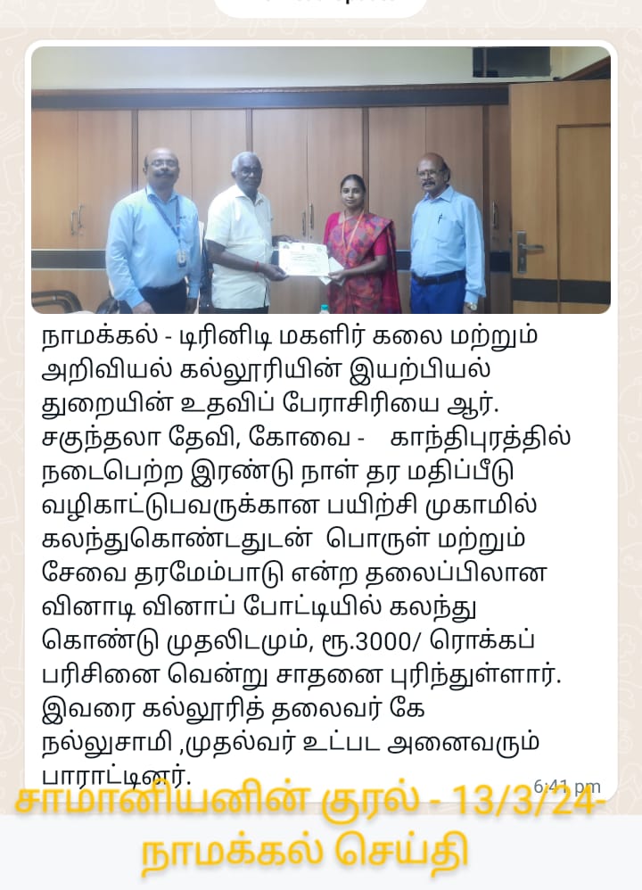 On behalf of Trinity College for Women, Namakkal, Dr. R. Sakunthaladevi, Assistant Professor in Physics and the Coordinator of Standard Club, participated.