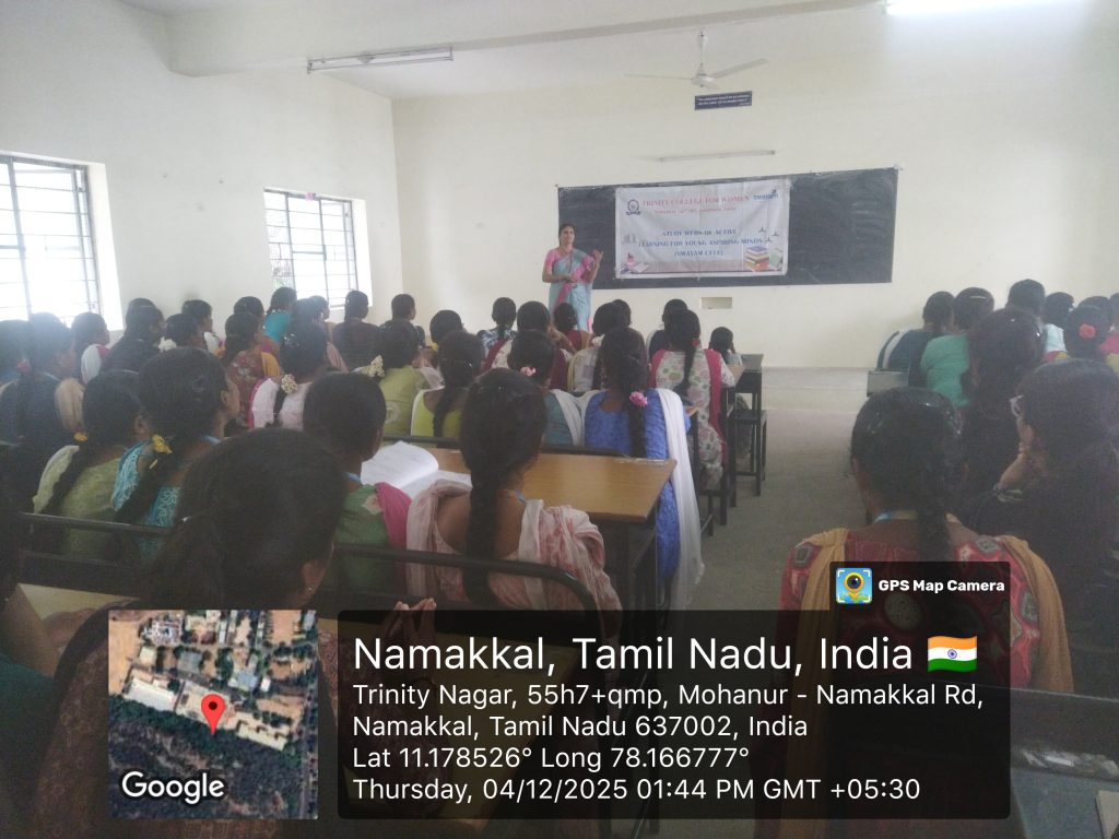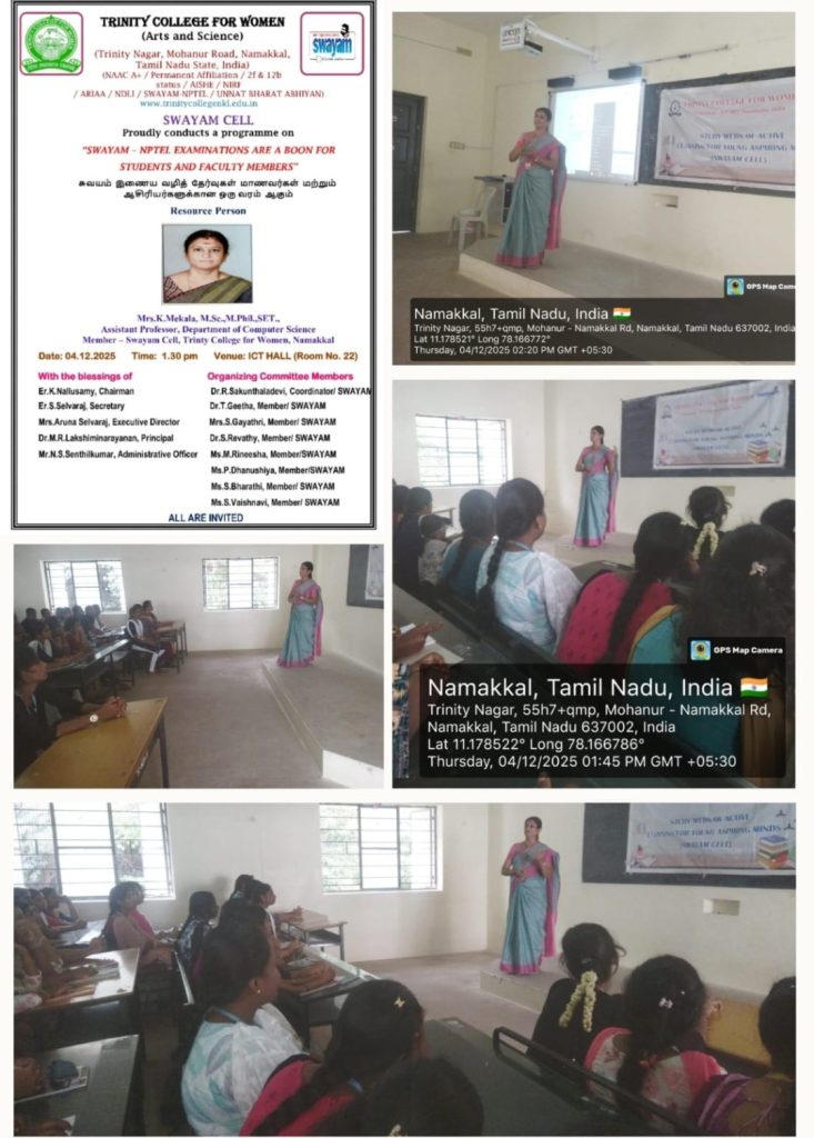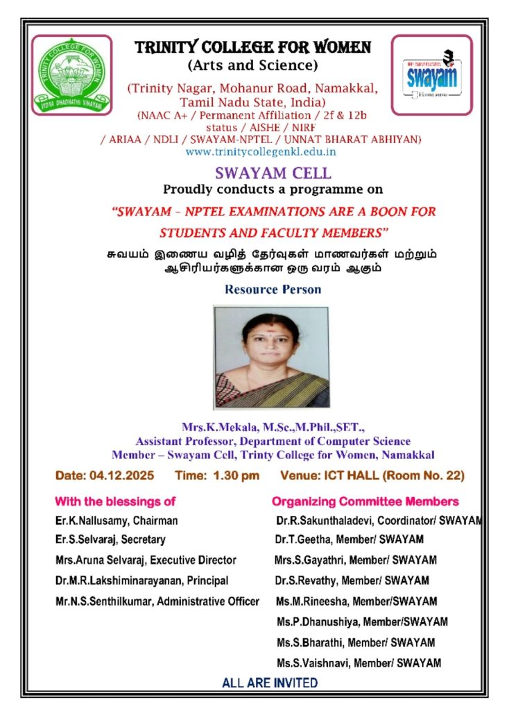 On behalf of SWAYAM Cell, Trinity College for Women, Namakkal conducted a programme titled “SWAYAM – NPTEL Examinations are a boon for students and faculty members” on 04th December 2025 on the College campus.
