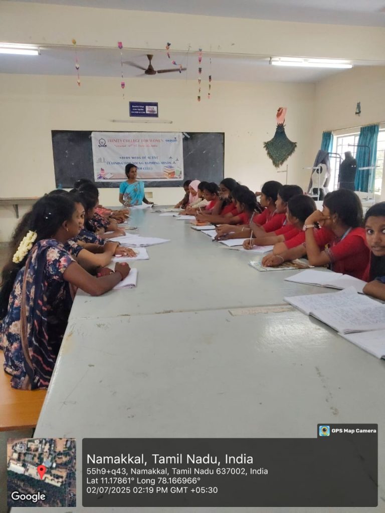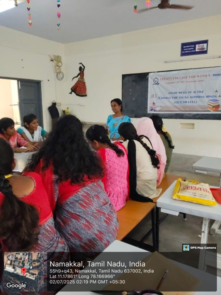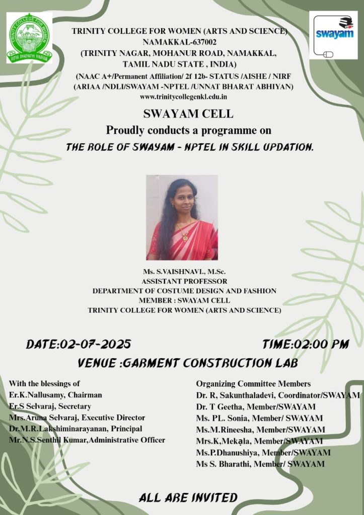 On behalf of SWAYAM Cell, Trinity College for Women, Namakkal conducted a programme titled “The Role of SWAYAM – NPTEL in Skill Updating” on 02nd July 2025 in the Garments Construction Lab.