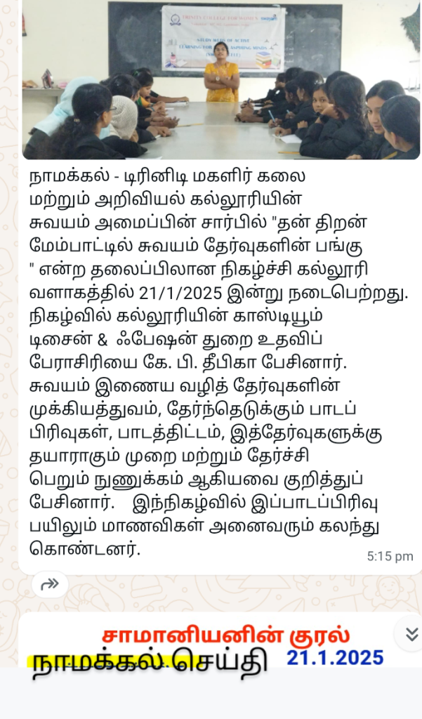 Ms. K.P. Theepika, Assistant Professor in Costume Design and Fashion, Trinity College for Women, Namakkal, spoke about the significance of SWAYAM online NPTEL Examinations, selection of subjects, syllabus, preparation methods and the strategies for completion of examinations. All the students of CDF of the College took part.