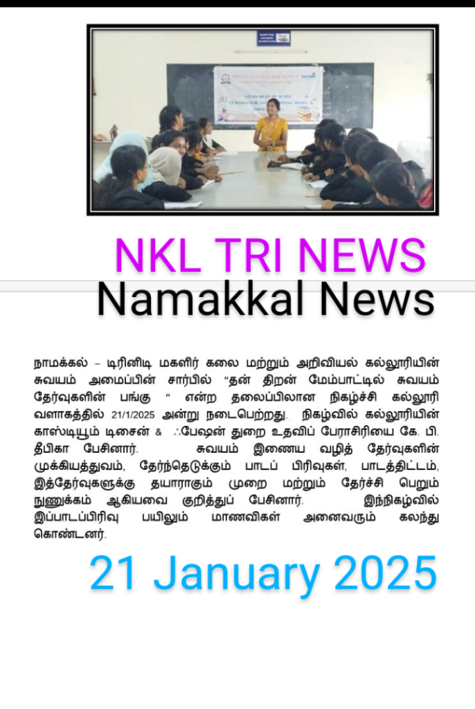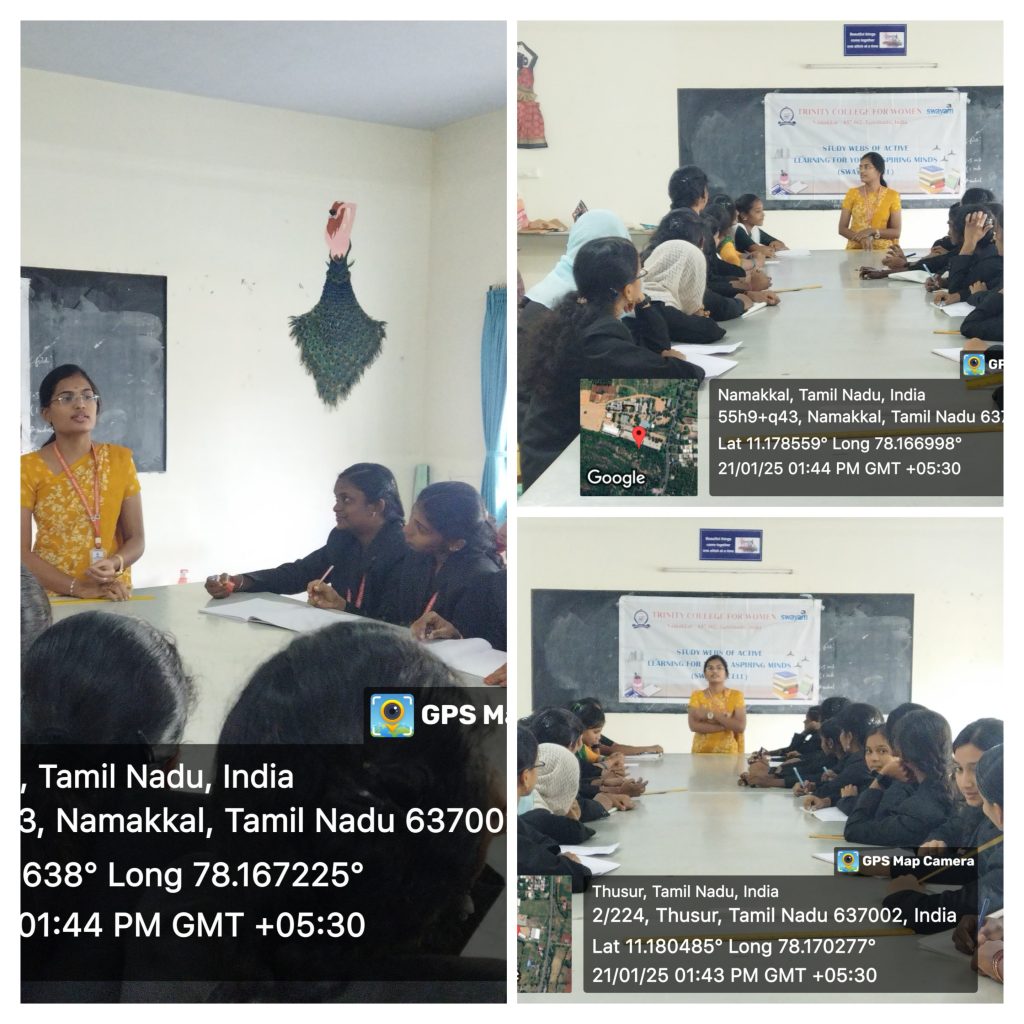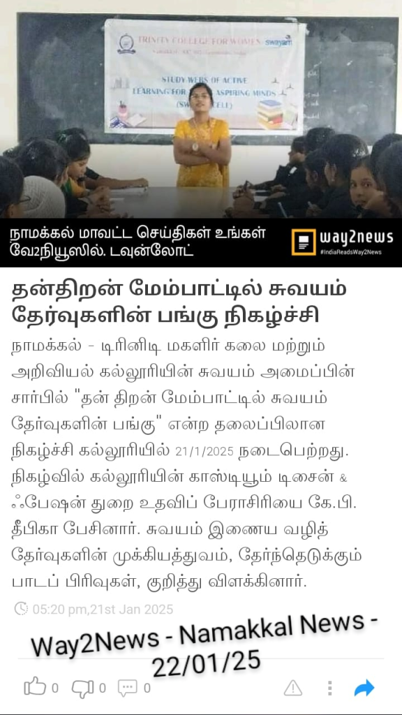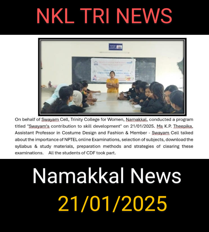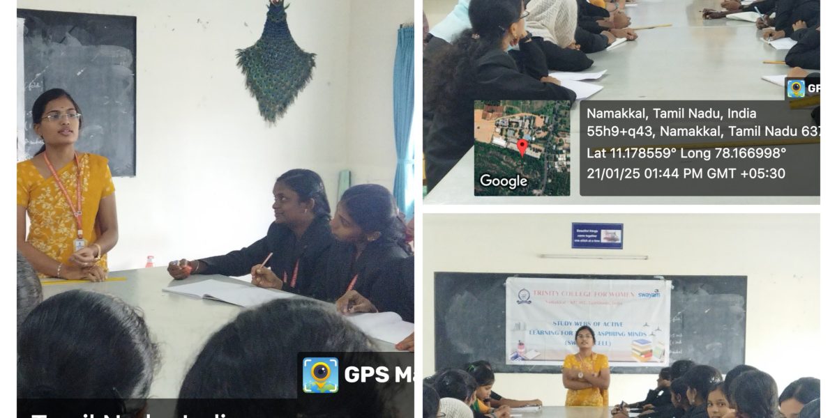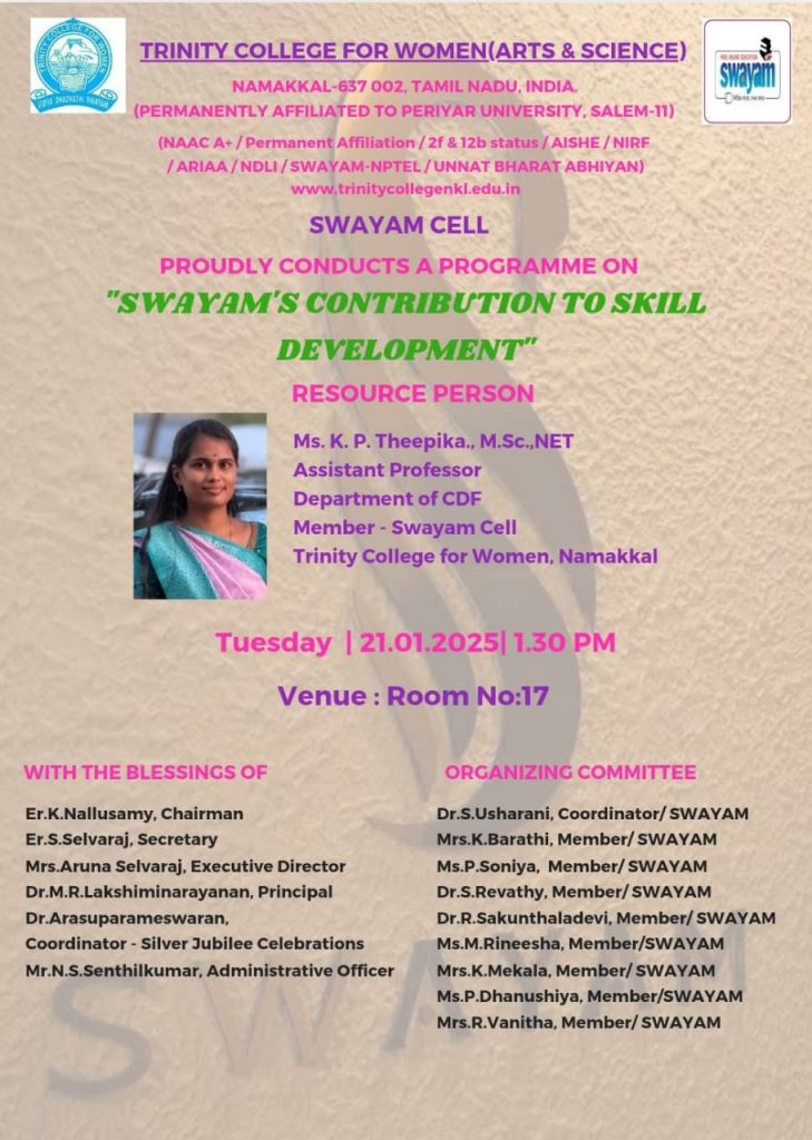 On behalf of Swayam Cell, Trinity College for Women, Namakkal conducted a SWAYAM – NPTEL awareness programme on 21st January 2025 in the College campus. The title of the programme – Swayam’s contribution to skill development.