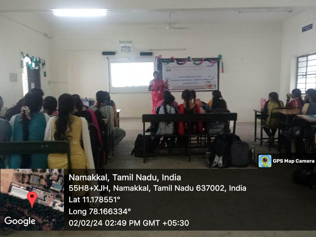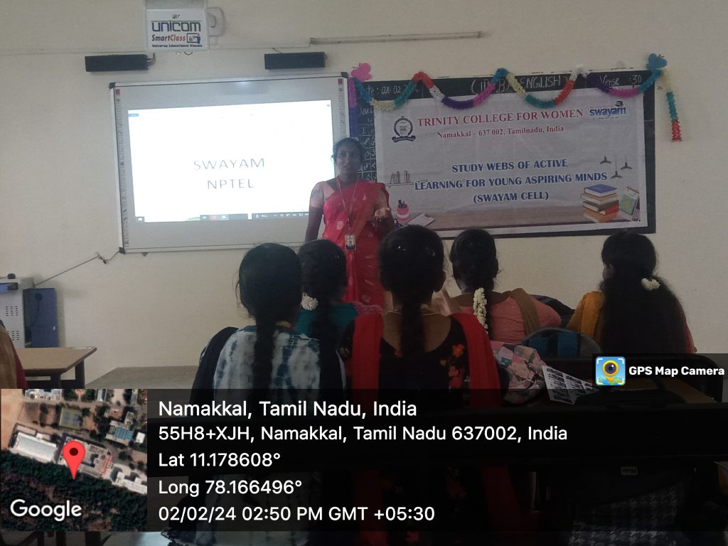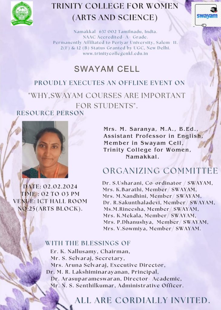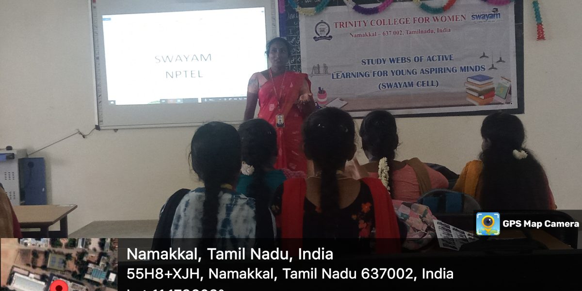 On behalf of Swayam Cell, Trinity College for Women, Namakkal conducted an awareness program titled “Why, SWAYAM courses are important for students?” on February 2, 2024, on the college campus. Mrs. M. Saranya, Assistant Professor in English and Coordinator, SWAYAM Cell, Trinity College for Women, Namakkal, was the resource person. SWAYAM courses are designed and developed for the sake of students and faculty who are in the fields of higher education. Students and faculty can shine in multiple fields. The higher authorities of many higher educational institutions have encouraged teachers and students. They insist that at least they have to complete one or two SWAYAM online courses in a year, she said. Dr. S. Usharani, coordinator of SWAYAM Cell, also took part. More than 100 students benefited from this program.