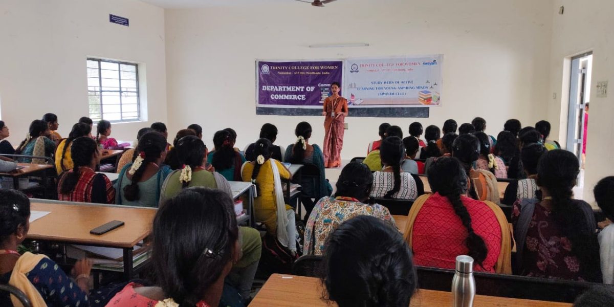 On behalf of SWAYAM Cell, Trinity College for Women, Namakkal organized a programme titled ‘An outline of SWAYAM – NPTEL Examinations” on 19th July 2024. Ms. P. Dhanushiya, Assistant Professor in Commerce & Member of SWAYAM, Trinity College for Women, Namakkal was the resource person. She explained the aims and benefits of swayam examinations and highlighted the various swayam online courses in the title of “Engineering, Health, health Science, humanities, Arts, management, Computer Science, Physical Sciences, etc., All the commerce students of our College have actively taken part.