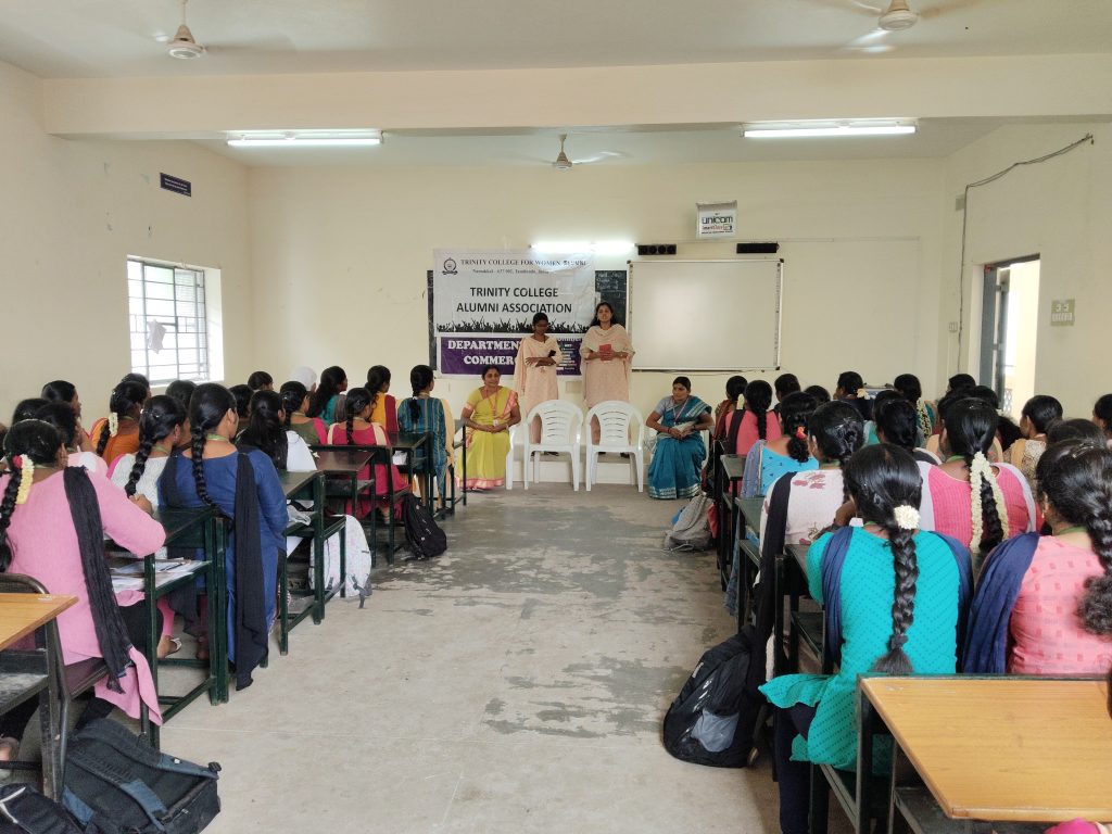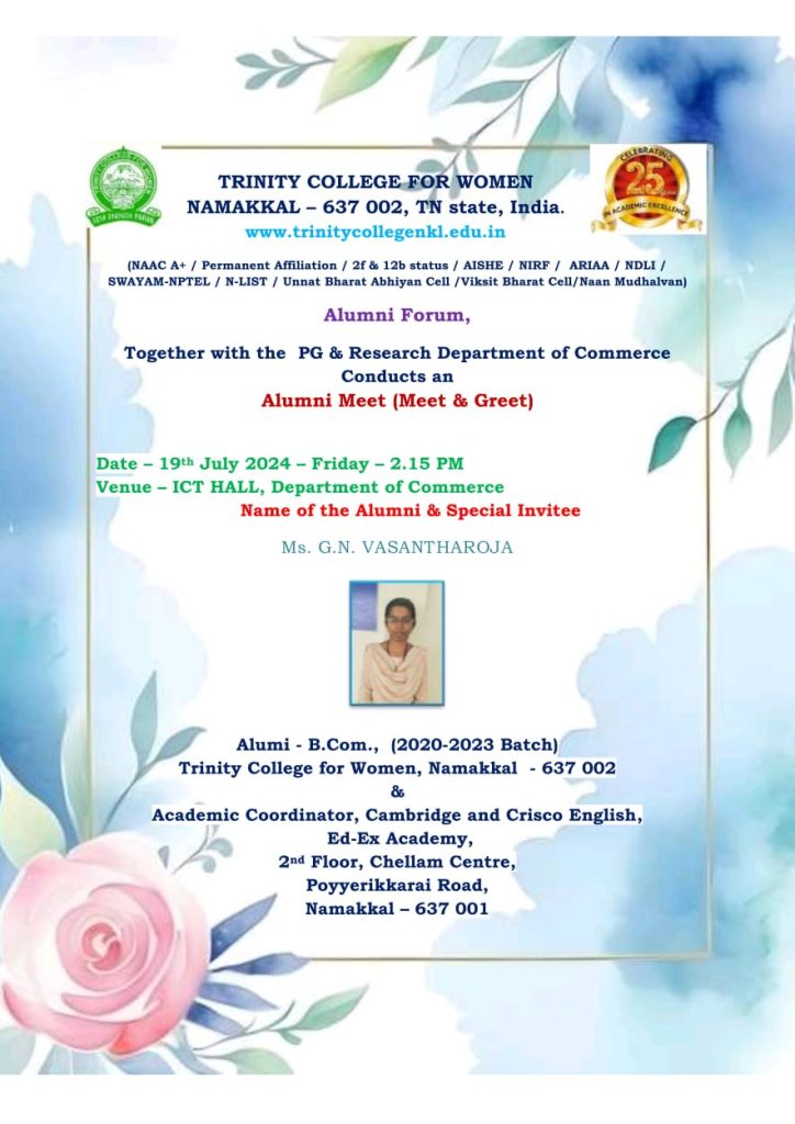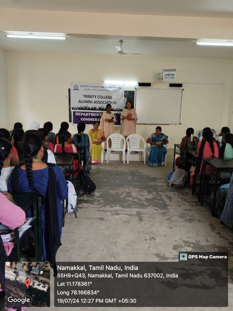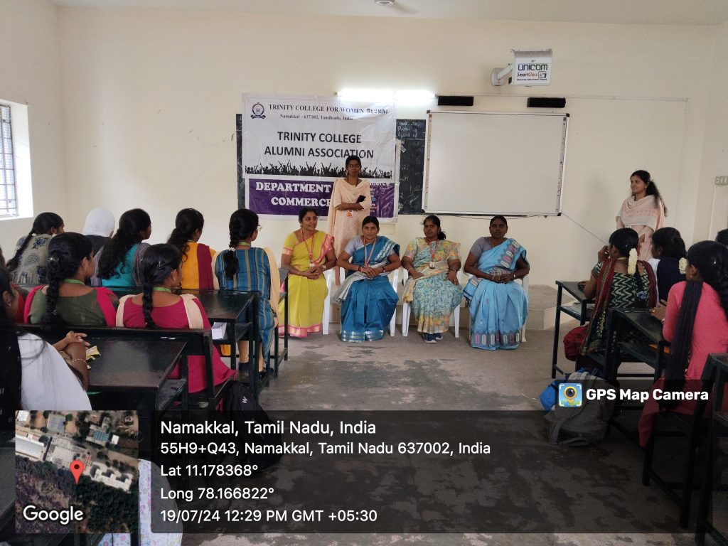 On behalf of the Alumni Forum, together with the Department of Commerce at Trinity College for Women, Namakkal organized “Alumni Meet” (Meet & Greet) on July 19, 2024, in the ICT Hall, Department of Commerce.