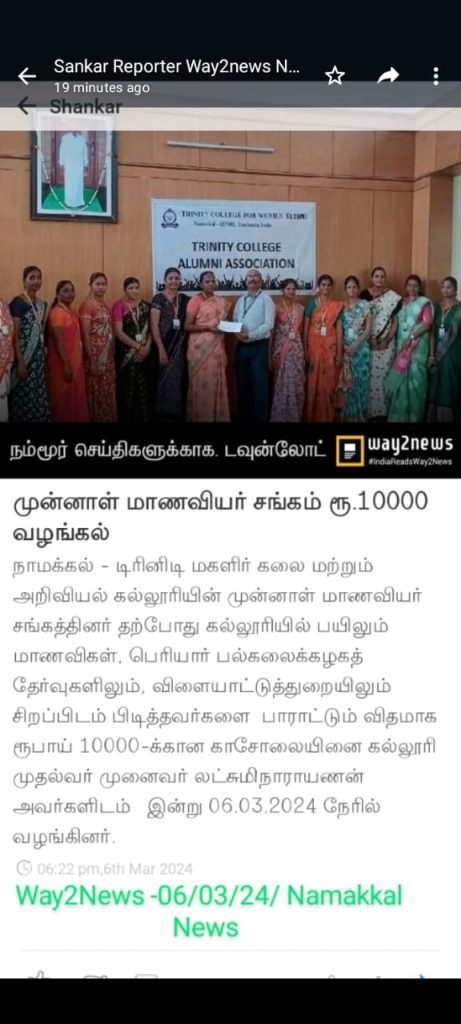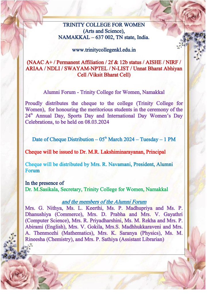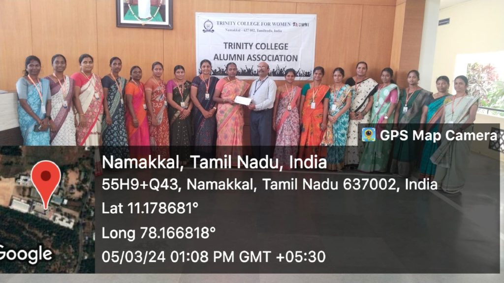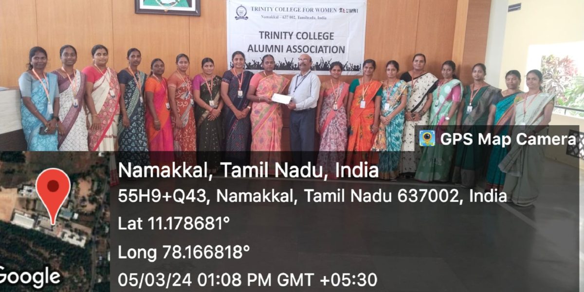 On behalf of the Alumni Forum, Trinity College for Women, Namakkal, Mrs. R. Navamani, President of the organization, has donated Rs. 10000/- (Rupees ten thousand only) in the form of a cheque to Dr M.R. Lakshiminarayanan, Principal, on March 5, 2024,  for the purpose of cash prize awards for the meritorious students of our college who have achieved in the Periyar University Examinations and the university-level sports events., The members of the Alumni Forum of our College, Dr. M. Sasikala, Mrs. G. Nithya, Ms. L. Keerthi, Ms. P. Madhupriya and Ms. P. Dhanushiya (Commerce), Mrs. D. Prabha and Mrs. V. Gayathri (Computer Science), Mrs. R. Priyadharshini, Ms. M. Rekha and Mrs. P. Abirami (English), Mrs. V. Gokila, Mrs.S. Madhukkaraveni and Mrs. A. Thenmozhi (Mathematics), Mrs. K. Saranya (Physics), Ms. M. Rineesha (Chemistry), and Mrs. P. Sathiya (Assistant Librarian) also took part on that occasion.
