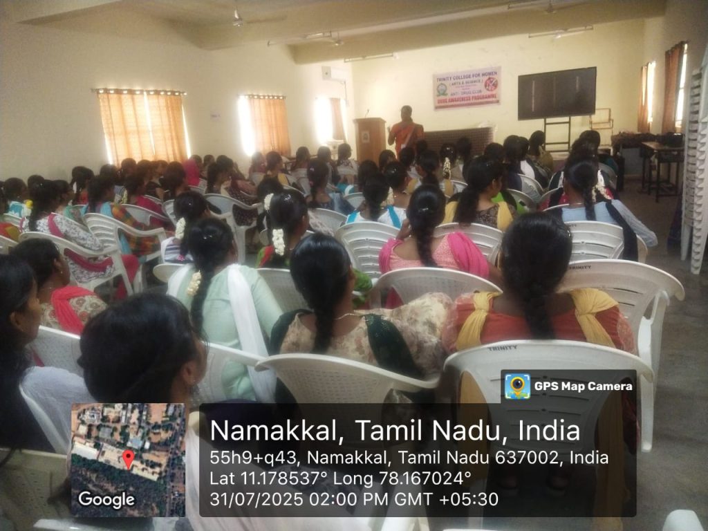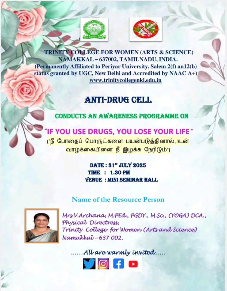 On behalf of the Anti-Drug Club, Trinity College for Women, Namakkal conducted an awareness programme titled “If you use drugs, you lose your life” on 31.07.2025. Mrs.V. Archana, Physical Directress, Trinity College for Women, Namakkal was the resource person.