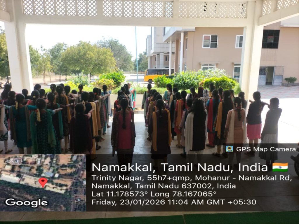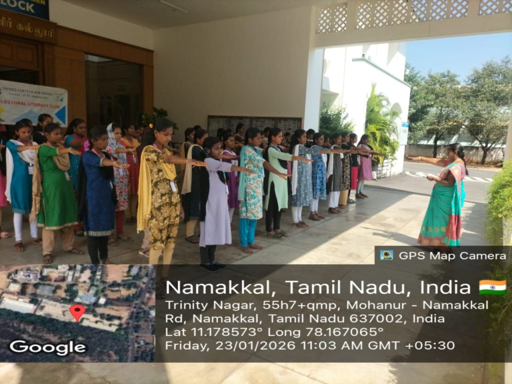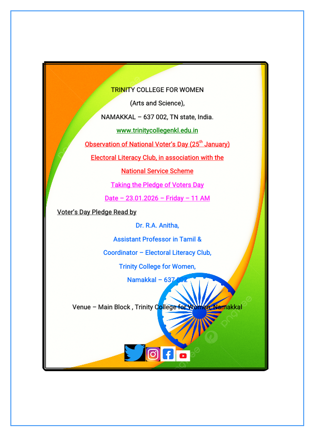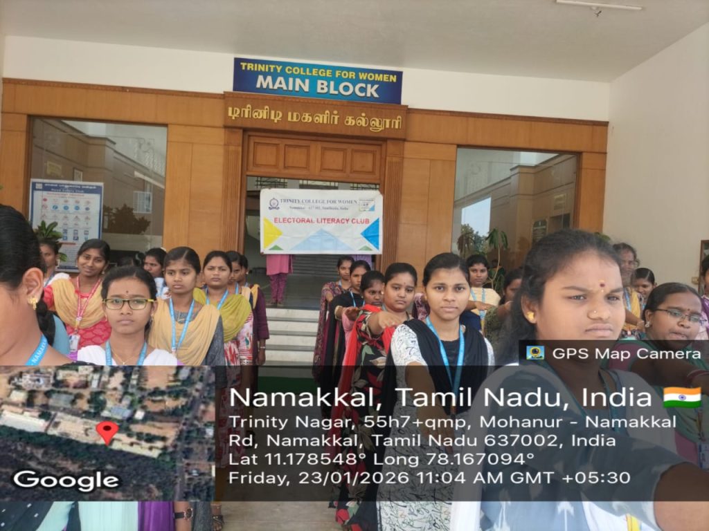 On behalf of the Electoral Literacy Club, in association with the National Service Scheme, Trinity College for Women, Namakkal observed National Voters Day with a solemn pledge-taking ceremony on 23.01.2026 in the College premises. Dr. R.A. Anitha, Assistant Professor in Tamil & Coordinator – Electoral Literacy Club, Trinity College for Women, Namakkal, talked about the significance of the day in her address to the students of the College. She administered the Voters Day Pledge to the entire student community as well as faculty members of the College.