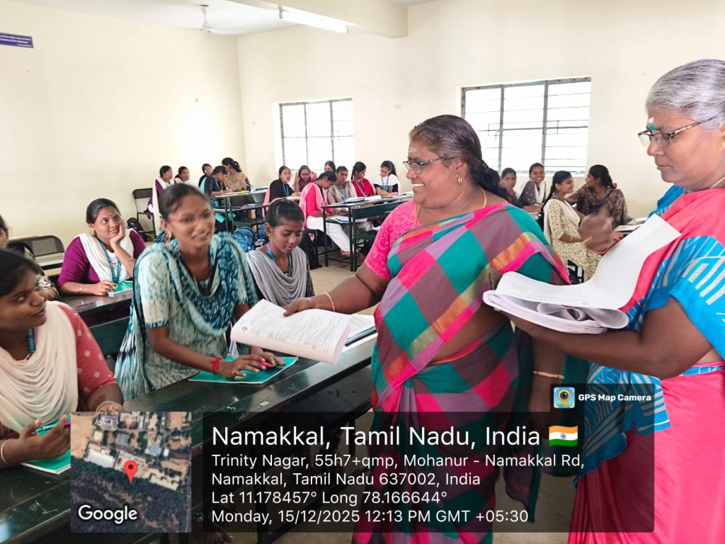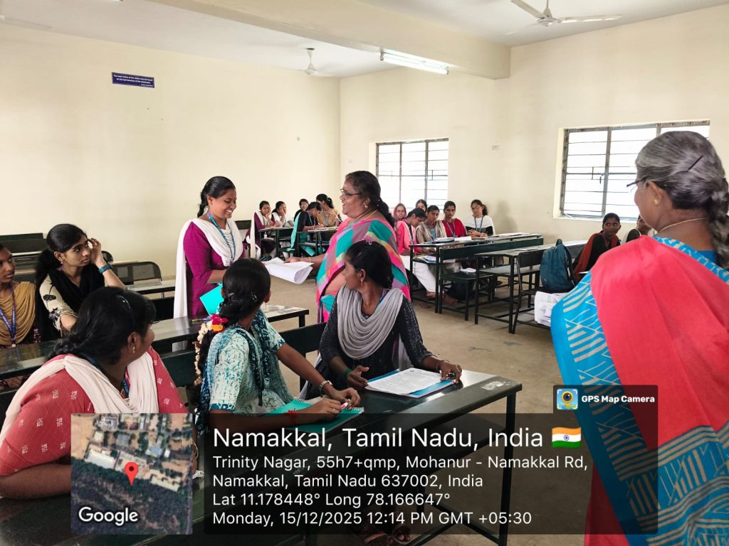 On behalf of the Electoral Literacy Forum, Trinity College for Women, Namakkal, organized a “New Voters’ Enrolment Camp” in the College campus on 15.12.2025. This programme was held with the support of the Department of Revenue, Namakkal District.