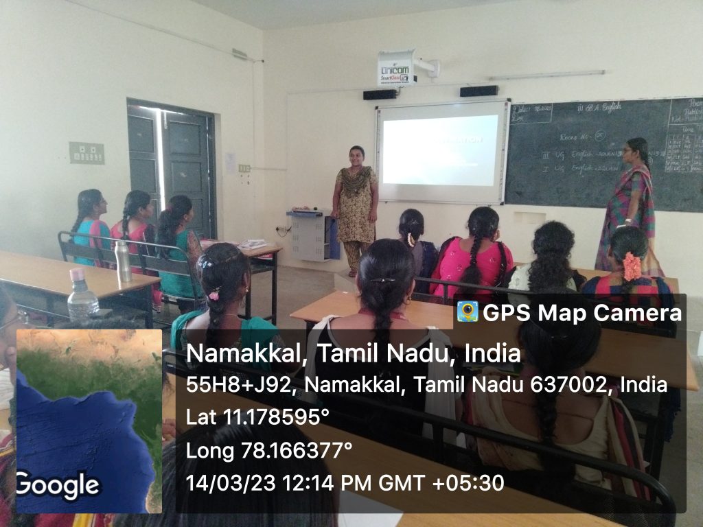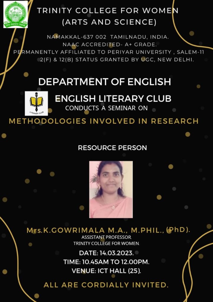 On behalf of the English Literary Club, Department of English, Trinity College for Women, Namakkal organized a seminar entitled “Methodologies involved in Research” on 14th March 2023. Mrs. K. Gowrimala, Assistant Professor in English, Trinity College for Women, Namakkal was the special invitee and she explained the various topics viz methodologies in research, formats of research, preparation of documentation and plagiarism in research.