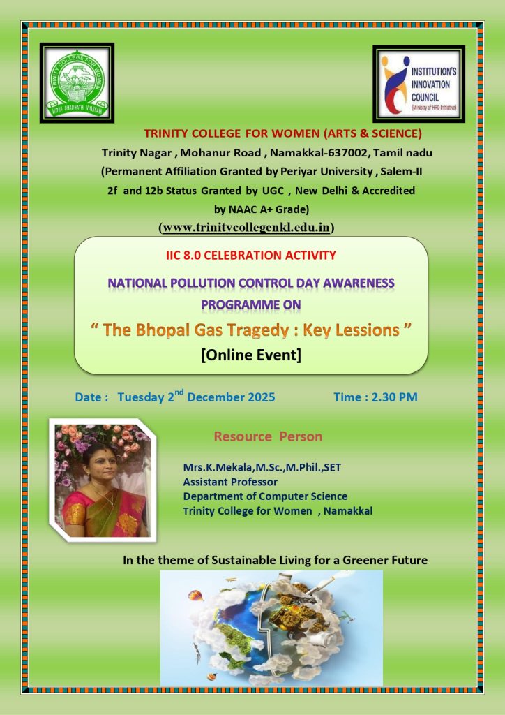 On behalf of the Institution’s Innovation Council, Trinity College for Women, Namakkal, observed the “National Pollution Control Day Awareness programme” on 02nd December 2025. It was one of the IIC 8.0 celebration activities.