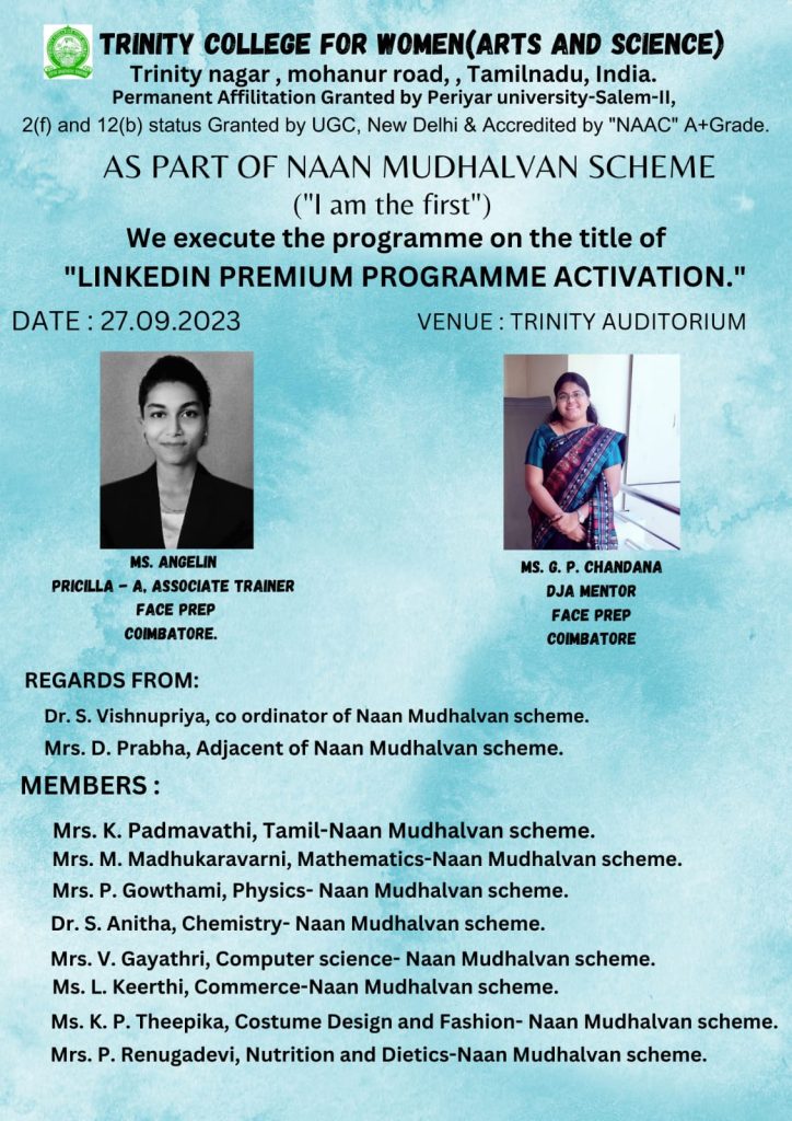 On behalf of the Naan Mudhalvan Scheme (I am the first), Trinity College for Women, Namakkal, conducted a one-day training event entitled “Linkedin Premium Programme Activation” on September 27, 2023, in the college premises.