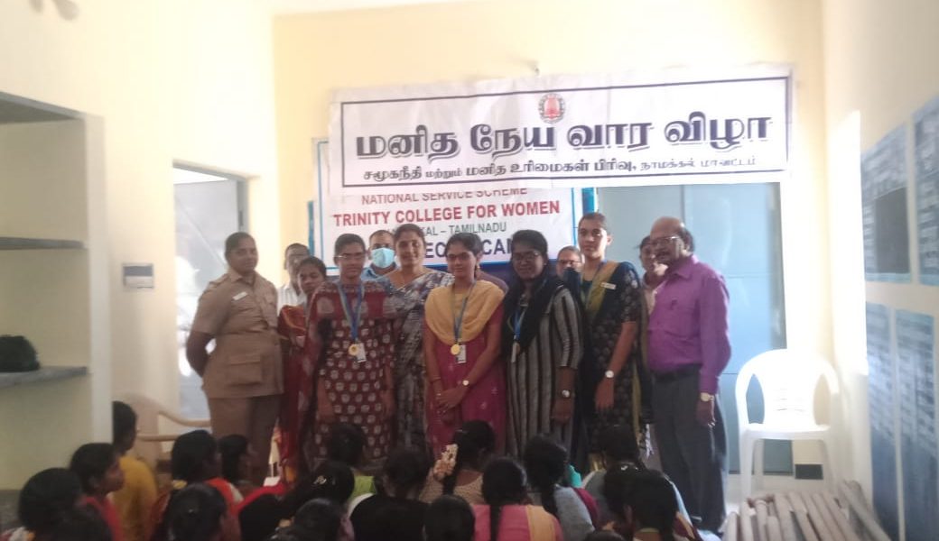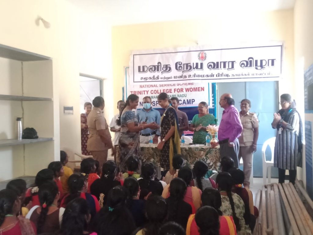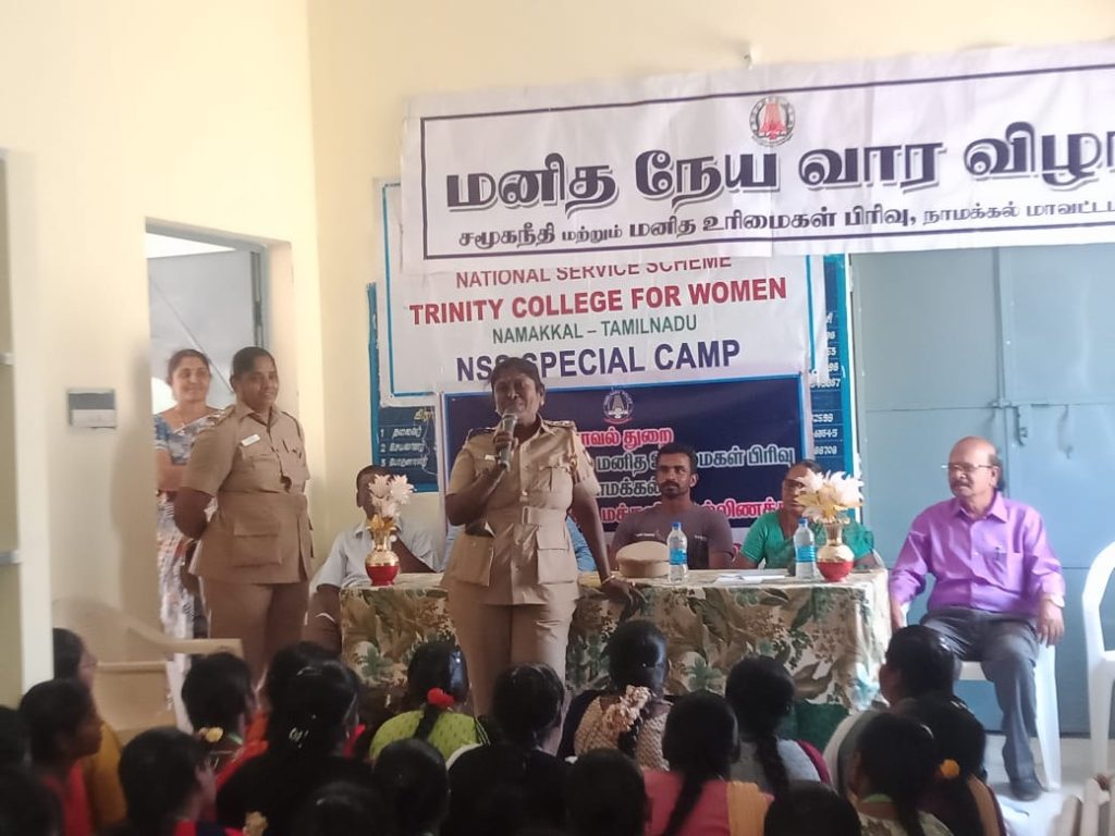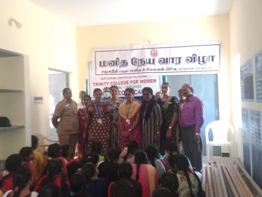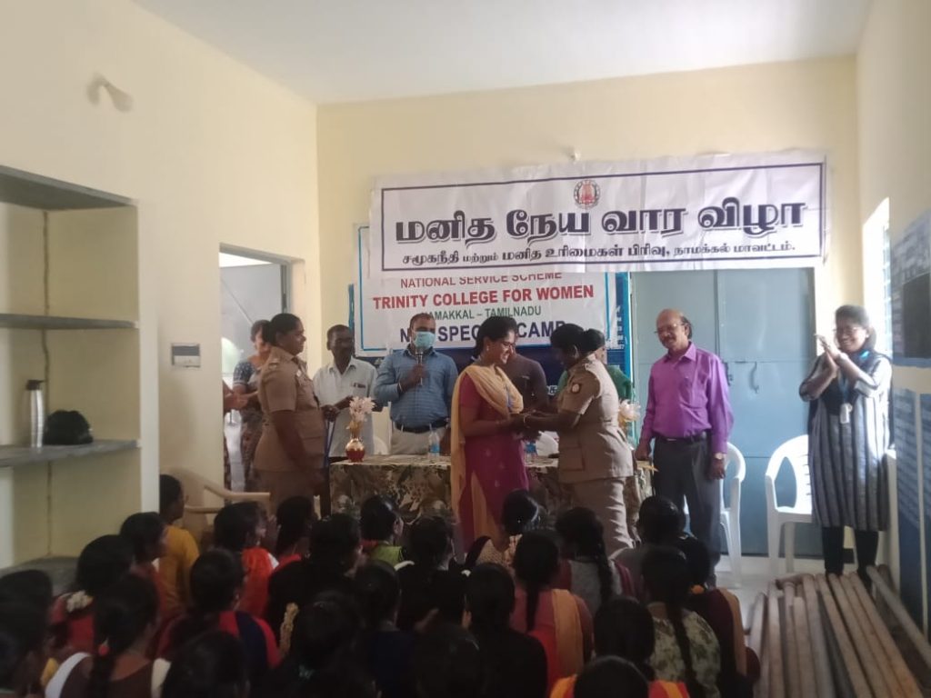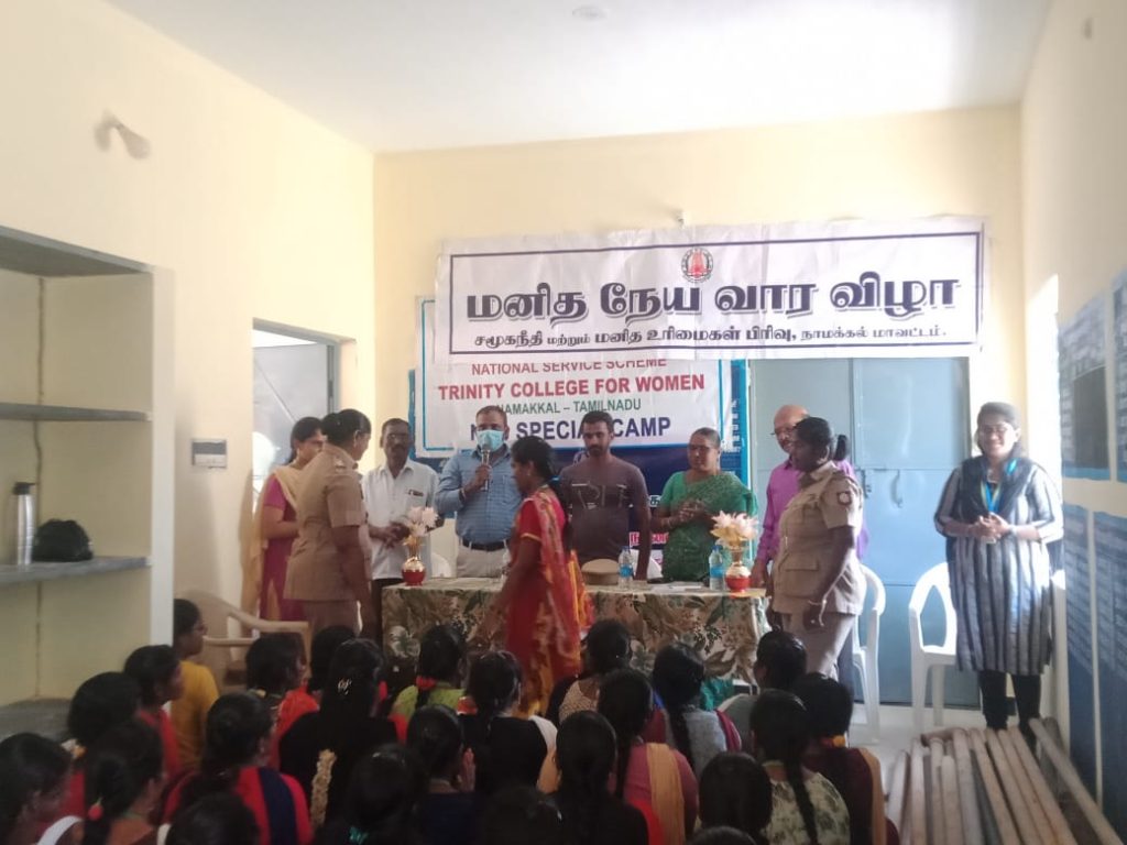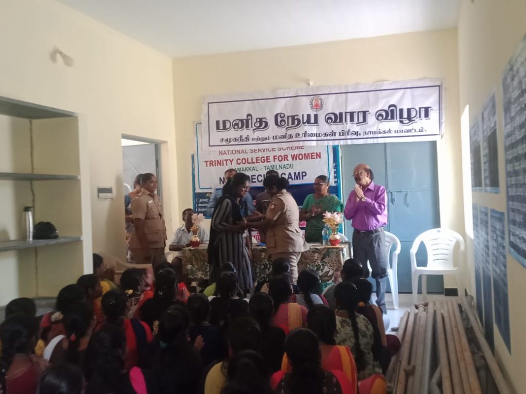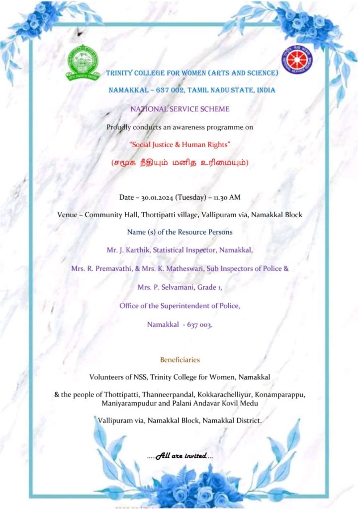 On behalf of the National Service Scheme, Trinity College for Women, Namakkal conducted an awareness program entitled “Social Justice and Human Rights” on January 30th, 2024. It was held in the premises of the community hall, Thottipatti village, Vallipuram via, Namakkal district. Mr. J. Karthik, Statistical Inspector, Human Rights, Namakkal, Mrs. R. Premavathi, Mrs. K. Matheswari, Sub Inspectors of Police, and Mrs. P. Selvamani, Grade 1 Police, Office of the Superintendent of Police, Namakkal were the special invitees.