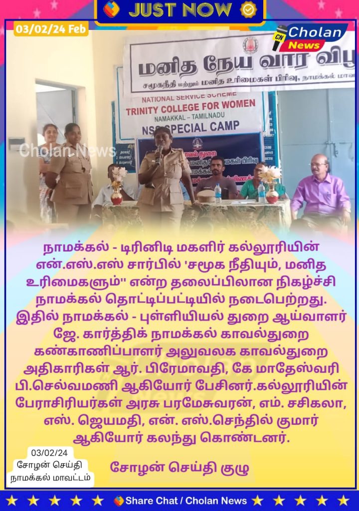 Apart from that, on behalf of the department of police, Namakkal district humanity medals were given away to the following students of Trinity College for Women on that day.