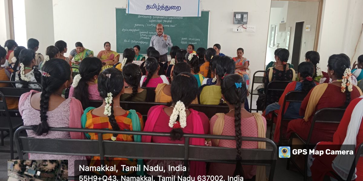 On behalf of the Postgraduate and Research Department of Tamil, Trinity College for Women, Namakkal conducted a “Career Guidance Programme ” on July 9, 2024, on the college campus. Dr. Arasuparameswaran, Kalaimamani and Tamil Chemmal Awardee, and the former faculty of Tamil, Arignar Anna Government Arts College, Namakkal, was the special invitee.