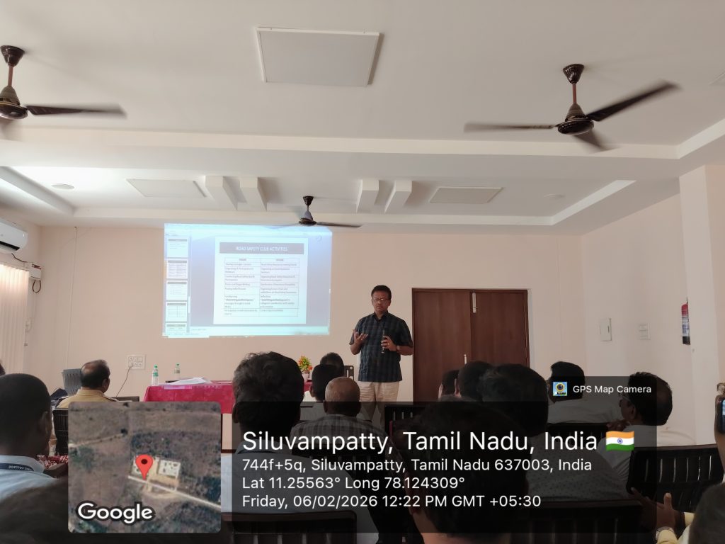 Mr. E.S. Murugesan, Regional Transport Officer, Namakkal South, in his keynote address, Tamil Nadu State consistently ranks as one of the states with the highest number of road accidents in India. Each one, we must follow the road traffic rules, avoid distractions like mobile phones, never drink and drive, wear helmets/seat belts and maintain a safe speed and distance, he stated.