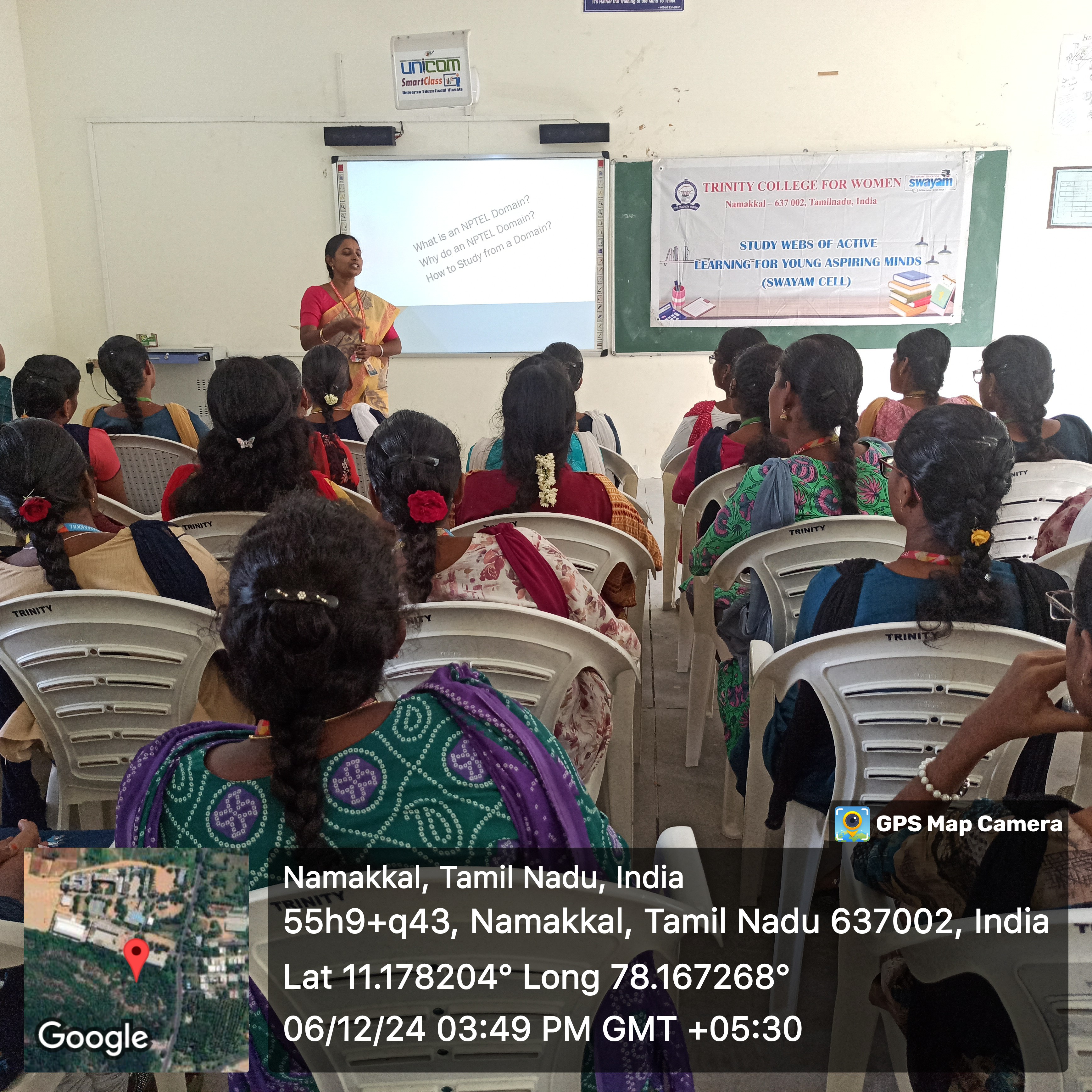 On behalf of the SWAYAM Cell, Trinity College for Women, Namakkal conducted a programme titled “SWAYAM – Innovative Technology for Higher Education” on 06th December 2024 on the college premises.