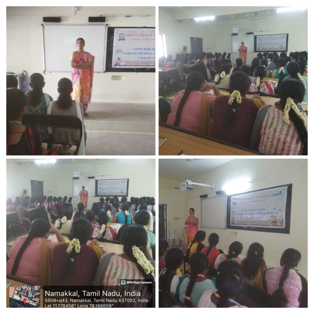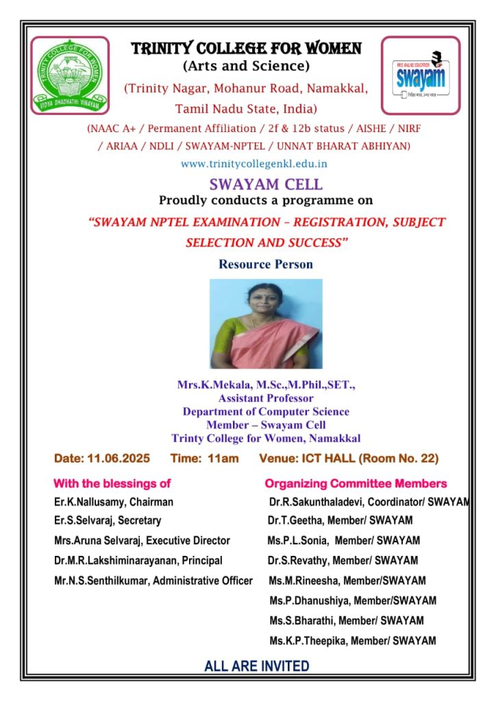 On behalf of the SWAYAM Cell, Trinity College for Women, Namakkal conducted a SWAYAM Awareness Programme titled “SWAYAM NPTEL Examinations – Registration, Subject Selection and Success” on 11th June 2025.