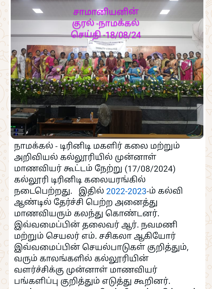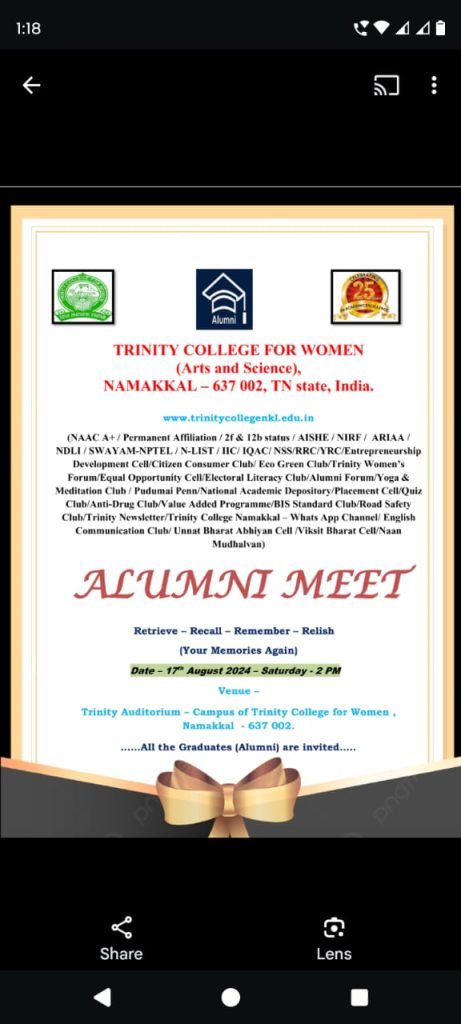On behalf of Trinity College for Women, Namakkal, an Alumni Meet was held on 17th August 2024 in the Trinity Auditorium for the students who have completed their degree in May/June– 2023.