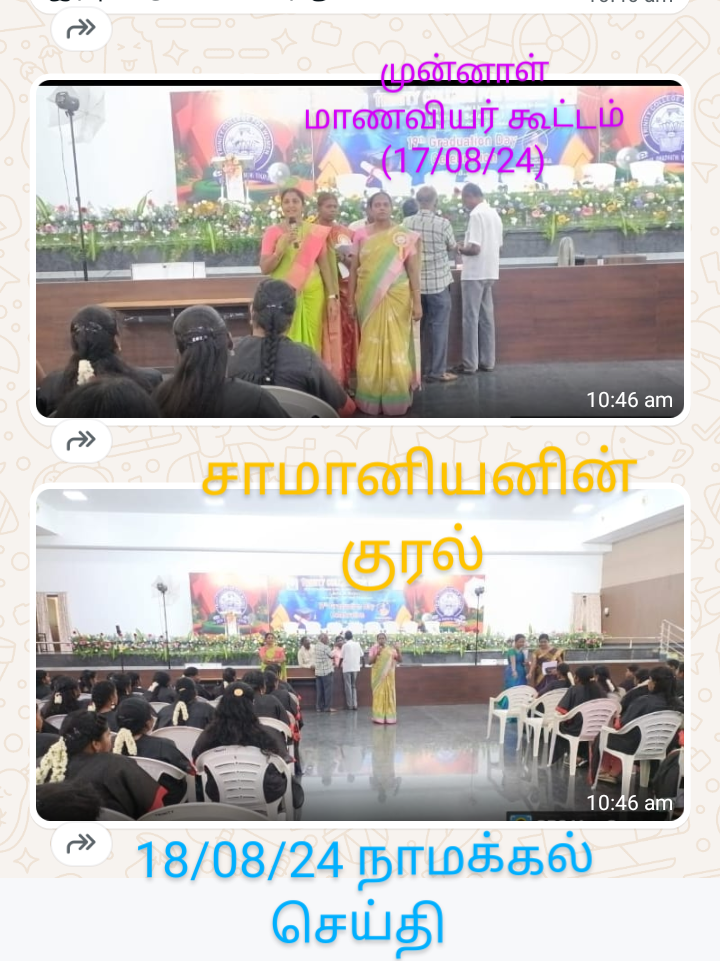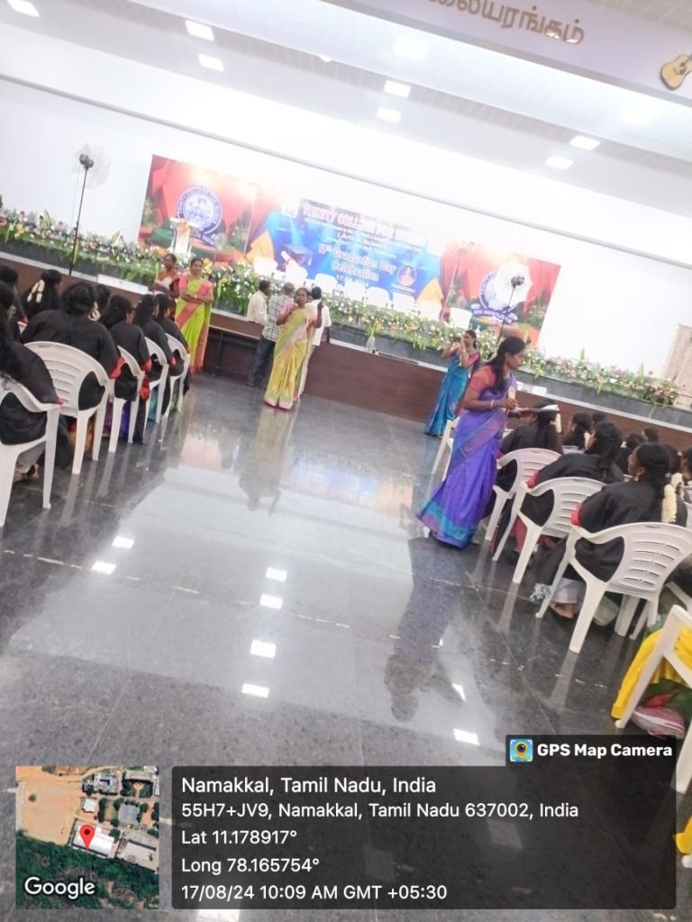 More than 400 students took part. This programme was arranged by the present faculty as well as old students of the College Mrs. G. Nithya, Ms. P. Madhupriya & Ms. P. Dhanushiya (Commerce), Ms. M. Rekha, Mrs. P. Abirami and Ms. R. Midhuna (English), Mrs. V.Gokila, Mrs. S. Madhukaraveni and Mrs. A. Thenmozhi (Mathematics), Mrs. K. Saranya, Mrs. P. Gowthami and Mrs. S. Sandhiya (Physics), Ms. M. Rineesha and Ms. K.L. Priyadharshini (Chemistry), Mrd. D. Prabha. Mrs. V. Gayathri and Mrs. M. Kiruthika (Computer Science), Ms. R. Saranyadevi (Costume Design and Fashion) and Mrs. P. Sathiya, Assistant Librarian.