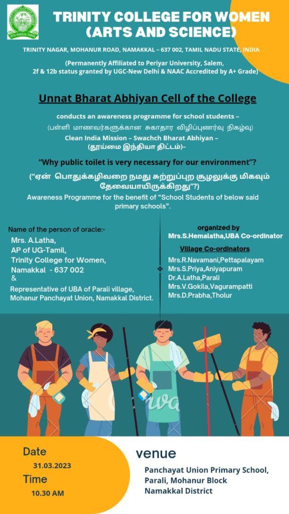 On behalf of Unnat Bharat Abhiyan Cell, Trinity College for Women, Namakkal conducted an awareness programme for the benefit of school students on 31.03.2023. Under the scheme of “Clean India Mission” – (Swachh Bharat Abhiyan – தூய்மை இந்தியா திட்டம் )“, this event was held for the sake of middle school students of Parali, Mohanur Taluk, Namakkal district.