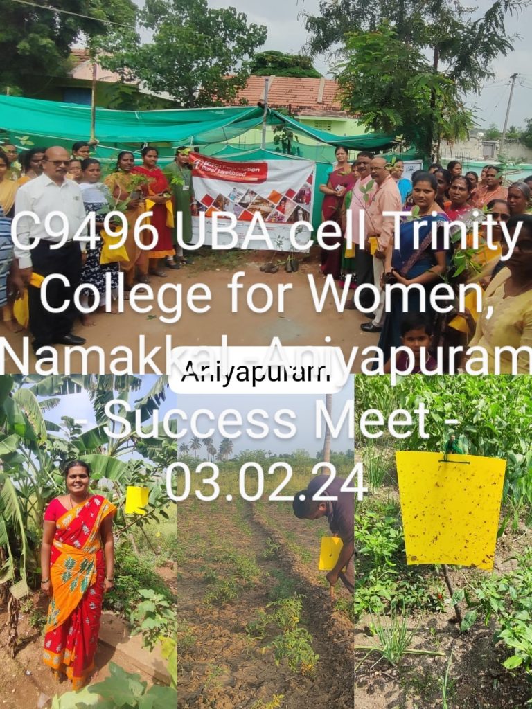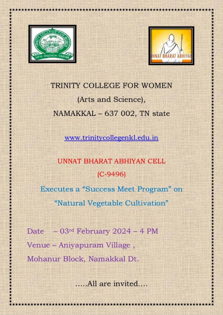 On behalf of Unnat Bharat Abhiyan Cell, Trinity College for Women, Namakkal, Rathinasabapathi Environmental Rural Development Organization (RERO), Namakkal, and ICICI Foundation for Inclusive Growth, Aniyapuram, Namakkal jointly conducted the event titled “Vegetable Home Gardening Promotion for Rural Women in and Around Aniyapuram Village” on December 28, 2023.