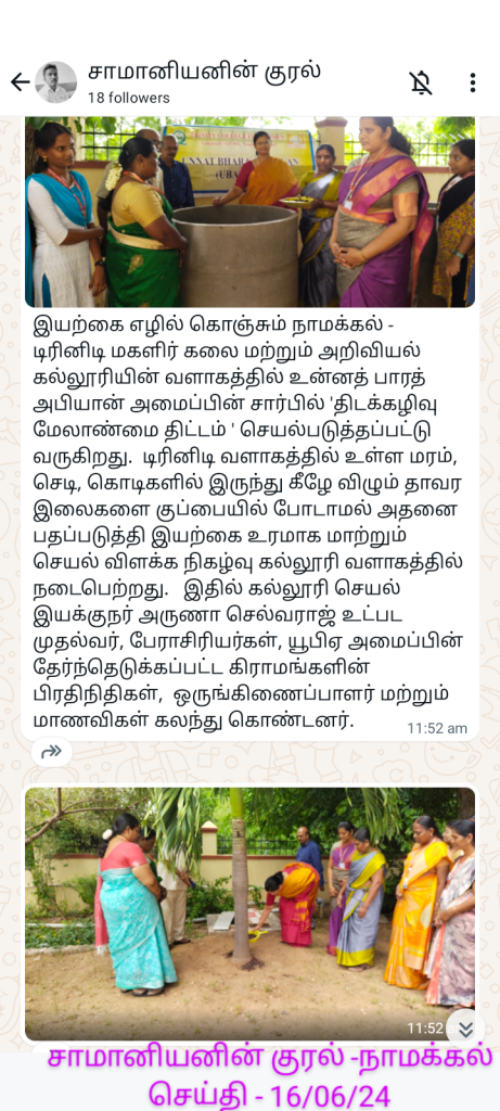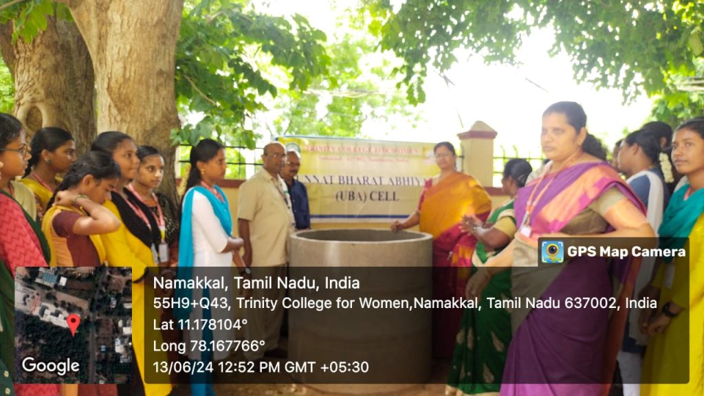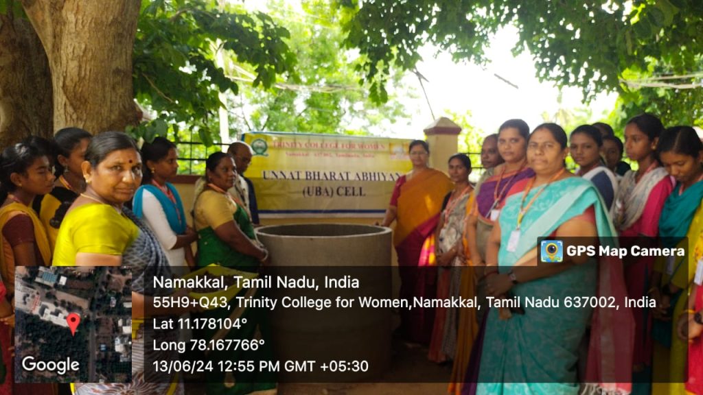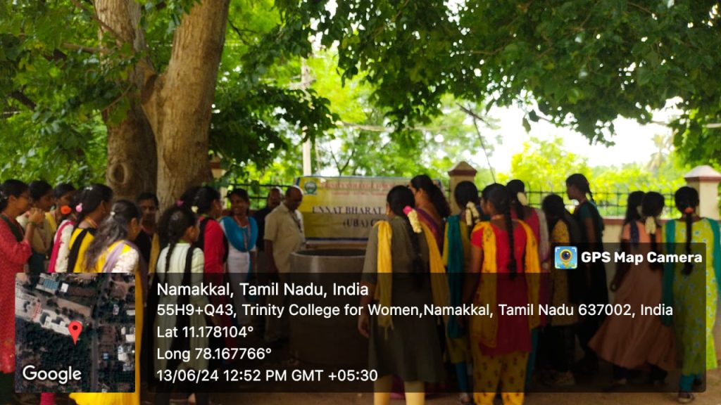 Mrs. S. Hemalatha, Assistant Professor in Tamil and Coordinator of Unnat Bharat Abhiyan Cell, Trinity College for Women, Namakkal, explained the process of solid waste management from the waste plant leaves to natural manure production. Due to the encouragement of solid waste management, we collected the leaves of trees and plants on the campus of Trinity Educational Institutions. Also, they put in the pit and recycle the compost produced in this way and use it again as organic farming. These organic fertilizers are used by plants and trees as natural compost, she said.