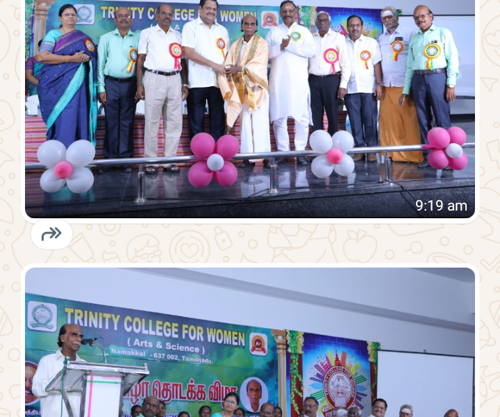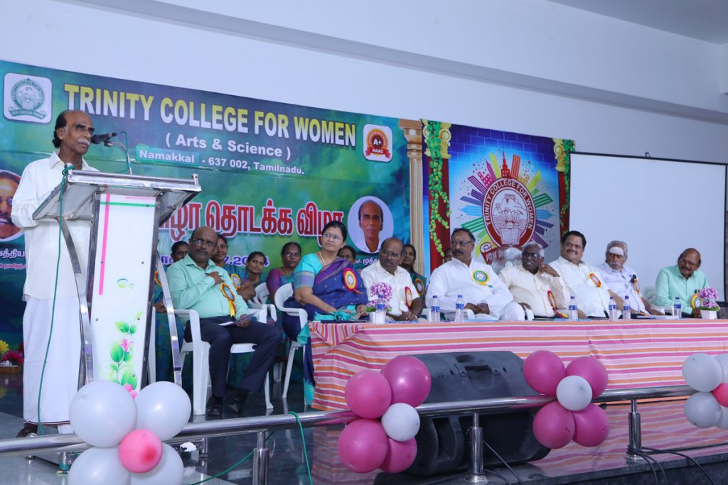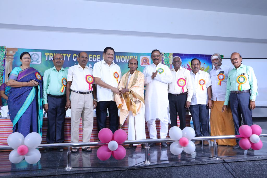 “This program was presided over by Er. K. Nallusamy, Chairman of the College. Dr. R. Kulandaivel, President, Trinity Academy Matric Higher Secondary School; Mr. P. Dhayalan, Transport Director, Trinity Academy Educational Institutions; Mr. Rama Srinivaasan, Secretary, Trinity International School; Mr. S. Selvaraj, Secretary; and Aruna Selvaraj, Executive Director, Trinity College for Women, offered their felicitation addresses. The college principal, Mr. M. R. Lakshminarayanan, extends a warm welcome to everyone. Dr. Arasuparameswaran, Coordinator, Silver Jubilee Celebrations Committee, Trinity College for Women, introduced the chief guests.