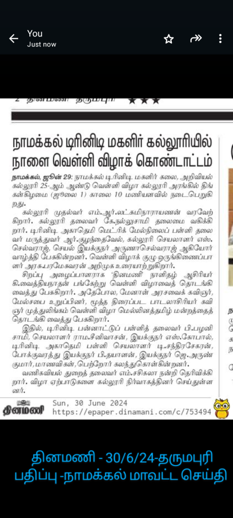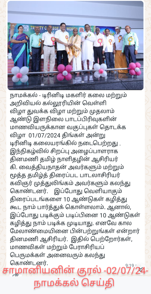 On July 1, 2024, a procession celebrating the 25th Silver Jubilee of Trinity College for Women, Namakkal, took place at the college campus, featuring cultural programs and academic achievements.