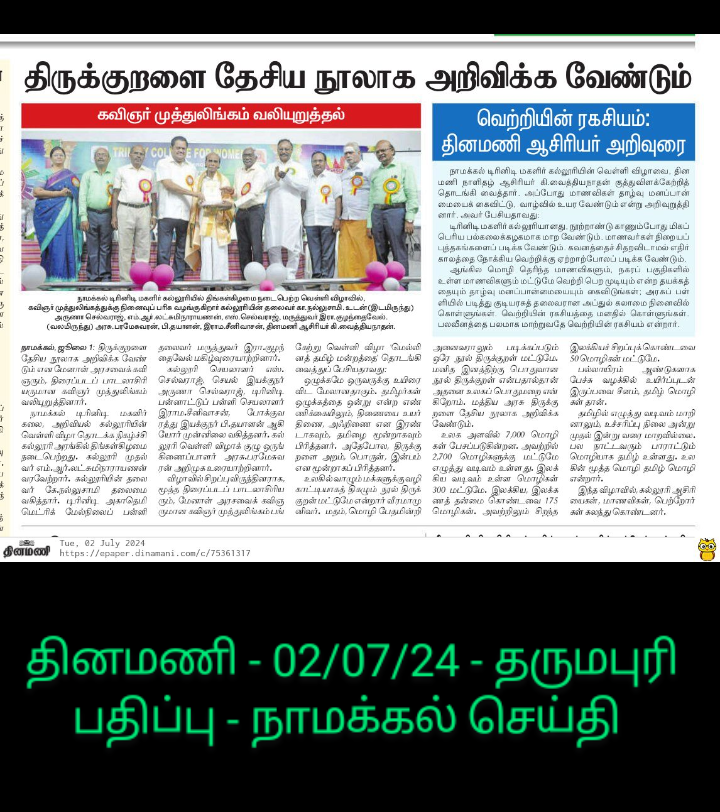 Most college students today need to engage more in self-study. This is because they are well-informed about their surroundings. We can watch movies ten years from now, but we must build our education now; we cannot delay it. In Tamil Nadu, students in cities like Chennai and Coimbatore have greater exposure compared to those in other parts of the state. This needs to be encouraged. Many achievers in the world come not from big cities like Mumbai, Delhi, Kolkata, or Chennai, but from ordinary towns or villages. Those of you from Namakkal should travel widely and achieve more through self-discipline. Be courageous and read newspapers daily. Learn Thirukkural daily. Take inspiration from leaders like Gandhi, Bharathi, Vivekanandar, Namakkal Kavignar, Kamarajar, Abdul Kalam, and others.