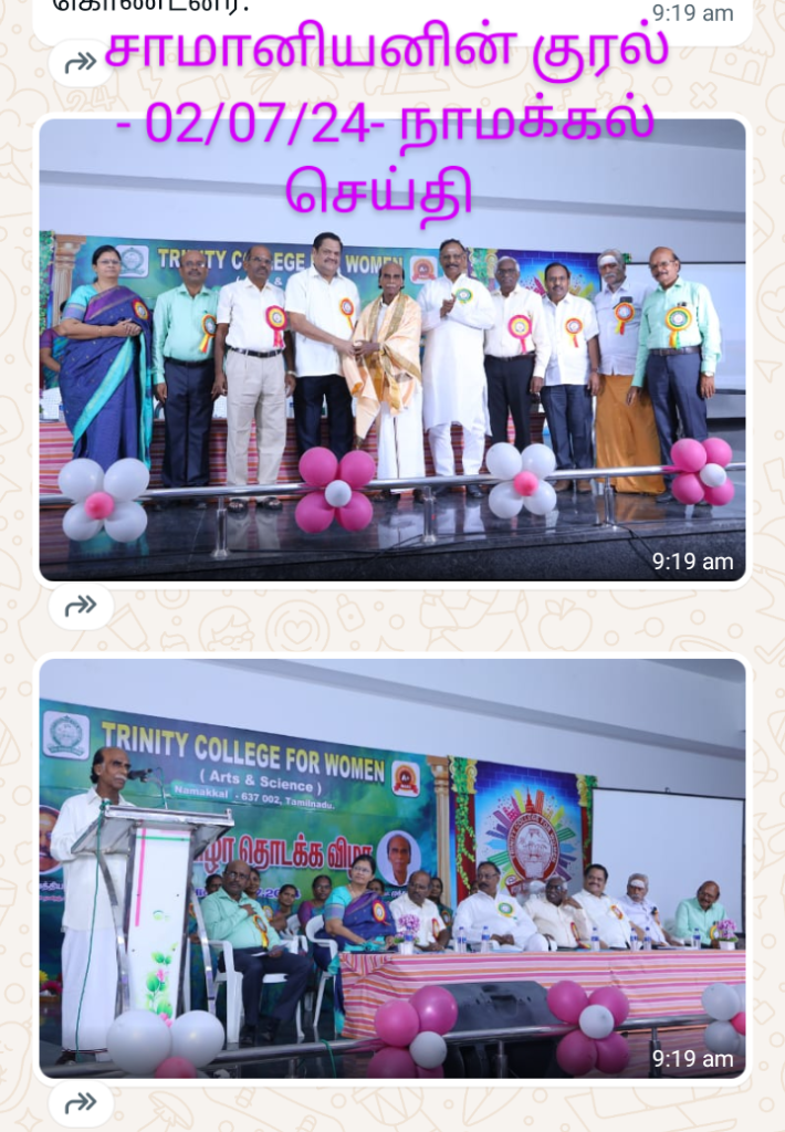 This program was hosted by Dr. T.K. Anuradha and Mrs. S. Jayamathi from the department of Tamil. The Administrative Officer, Mr. N.S. Senthil Kumar, organized technical arrangements. Nearly 2000 members attended the program. The event also featured cultural programs by students. Mr. S. Somasundaram, Principal, Trinity Academy Matric Higher Secondary School, Namakkal also took part.